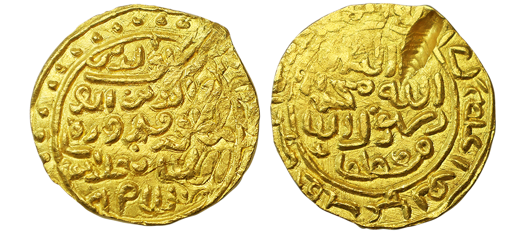 Bengal Sultanates, Jalal al-din Fath Shah (AH 886-893, 1481-1486 AD), Gold Tanka, 10.40gms, Khazana Mint , AH 887, decorative borders on both sides, rulers’s titles beginning with al sultan ibn al sultan spread over both sides with the additional title Shahi, G&G # B600, very fine+, extremely rare.
