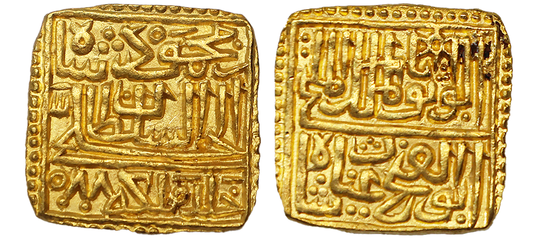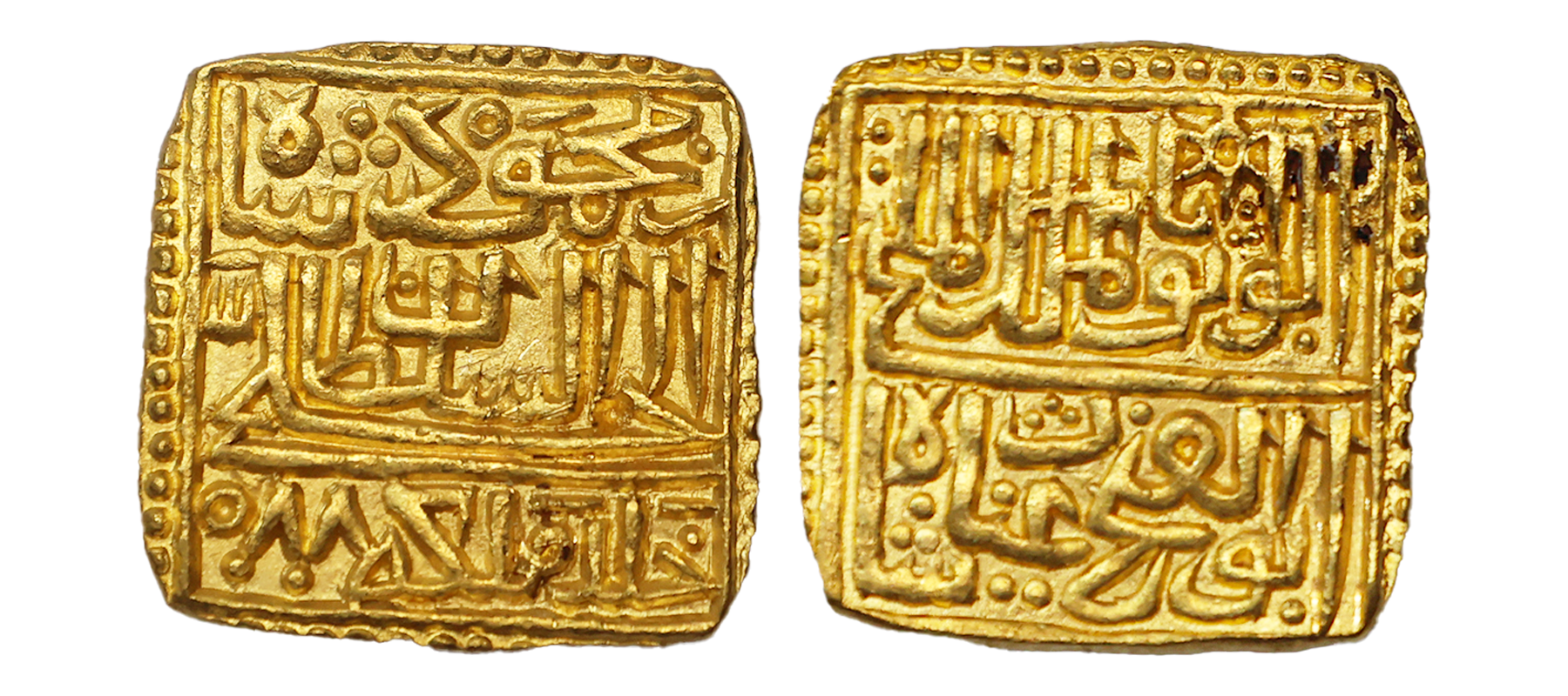 Malwa Sultanate, Ghiyath Shah (AH 873-906, AD 1469-1500), Gold Tanka, Big Flan with Dotted border on both sides, 11.50 gms, AH 880, Al wathiq Type, Obv. Al wathiq bi’I malik al-multaji abu’l fath ghiyath shah, Rev. bin Mahmud Shah al-Khilji al-sultan khald Allah Mulkahu, G&G #M66, Dotted border around on both side, Uncirculated, very rare.