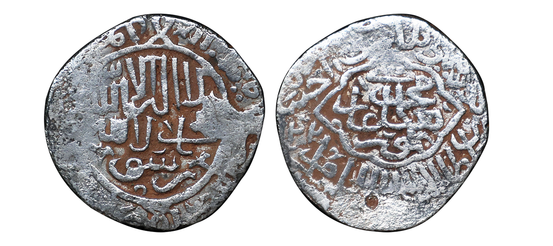 Humayun, First Reign (AH 937-947, 1530-1540 AD), Silver Shahrukhi, 4.64 gms, Agra Mint, AH 946, Obv. Kalima Shahada with Allah yarzuq man yasha'u ba ghair hisab, Rev. Muhammad Humayun Ghazi, within an octofoil, ‘al sultan ul azam al khaqan al mukarram, khuld Allahu ta'ala dhatahu wa mulkahu wa sultanahu zarb Agra’ Hull #1173, holed, very fine, very rare date.