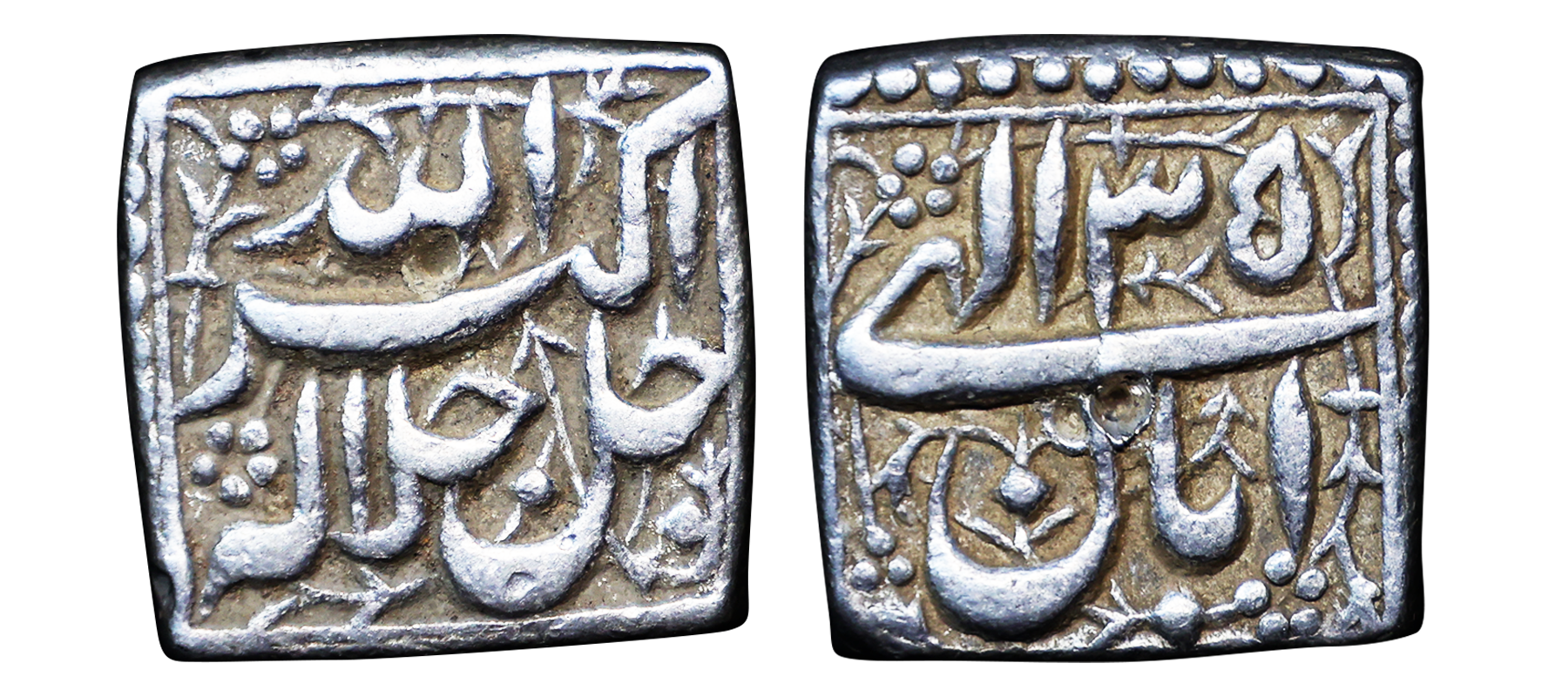 Akbar (AH 963-1014, 1556-1605 AD), Silver Square Rupee, 11.38 gms, Mintless Type, Ilahi Month Aban, Year 35, Obv. Jal-e-Jalal Akbar Allah, Rev. Ilahi 35 Aban, KM # 90.1, very fine+, very scarce.