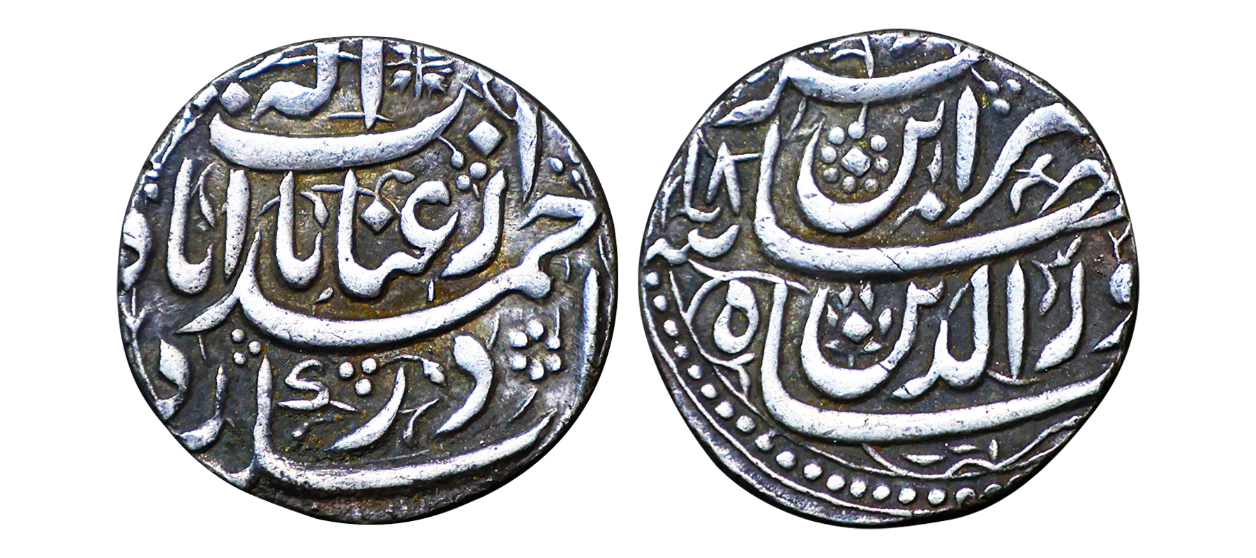 Jahangir (AH 1014-1037/1605-1627 AD) Ahmadabad Mint, Silver Rupee, AH (10)23, Month Di (Capricorn), "Muzaiyan" Couplet, Obv: Persian legend "ba naam Shah Noor ud din Jahangir" & Hijri year, Rev: Persian legend Elahi month 'Di' at the top, Muzaiyan, & "zarb Ahmadabad" at the bottom, (KM# 149.2), graded by NGC as AU58.