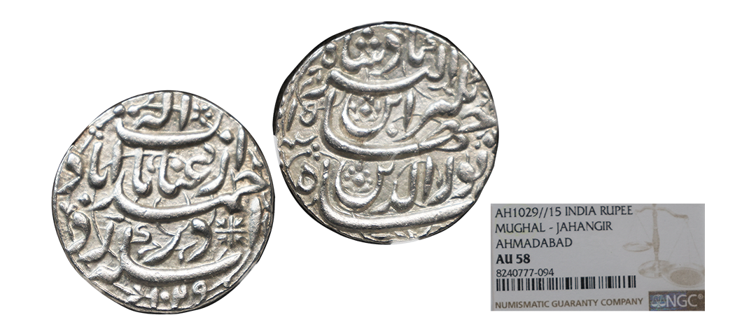 Jahangir (AH 1014-1037, 1605-1627 AD), Silver Rupee, 11.09 gms, Ahmadabad Mint, "Inayat Couplet", AH 1029, RY 15, Obv. Shah Noor ud din ibn Akbar Badshah, Rev. Sikka zad dar Ahmadabad ze Inayat Elah, KM # 149.4, extremely fine+, very scarce.