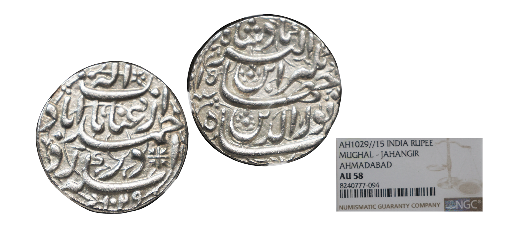 Jahangir (AH 1014-1037, 1605-1627 AD), Silver Rupee, 11.09 gms, Ahmadabad Mint, "Inayat Couplet", AH 1029, RY 15, Obv. Shah Noor ud din ibn Akbar Badshah, Rev. Sikka zad dar Ahmadabad ze Inayat Elah, KM # 149.4, extremely fine+, very scarce.