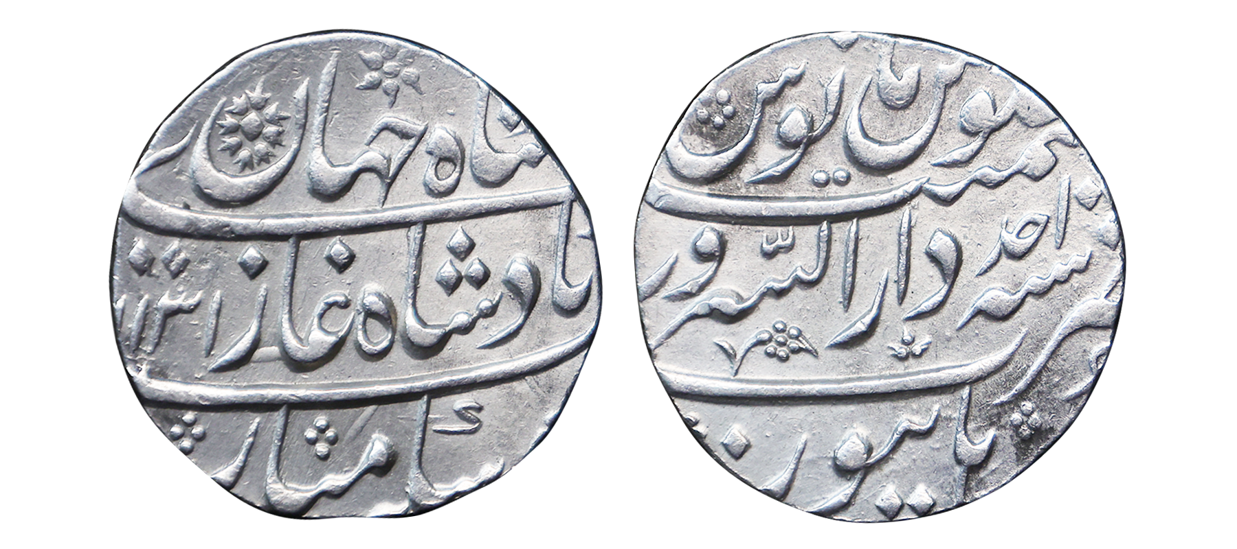 Rafi-ud-Darjat (AH 1131/1719 AD), Silver ½ Rupee, Surat Mint (by type), ‘Ba hazaran Barkat’ Couplet, Obv. sikka zad bahind bahazaraan barkaat, shahen shahe bahr-o-barr Rafi ud Darjat, Rev. manus maimanat sana julus zarb surat, KM #404.2, Graded by NGC as MS61, Top-Pop, extremely rare. Note: Fraction in Rafi-ud-Darjat are very rare, above specimen has a brilliant sharp strike with very high relief & pleasing lustre, Top-Pop(highest graded coin in NGC census).