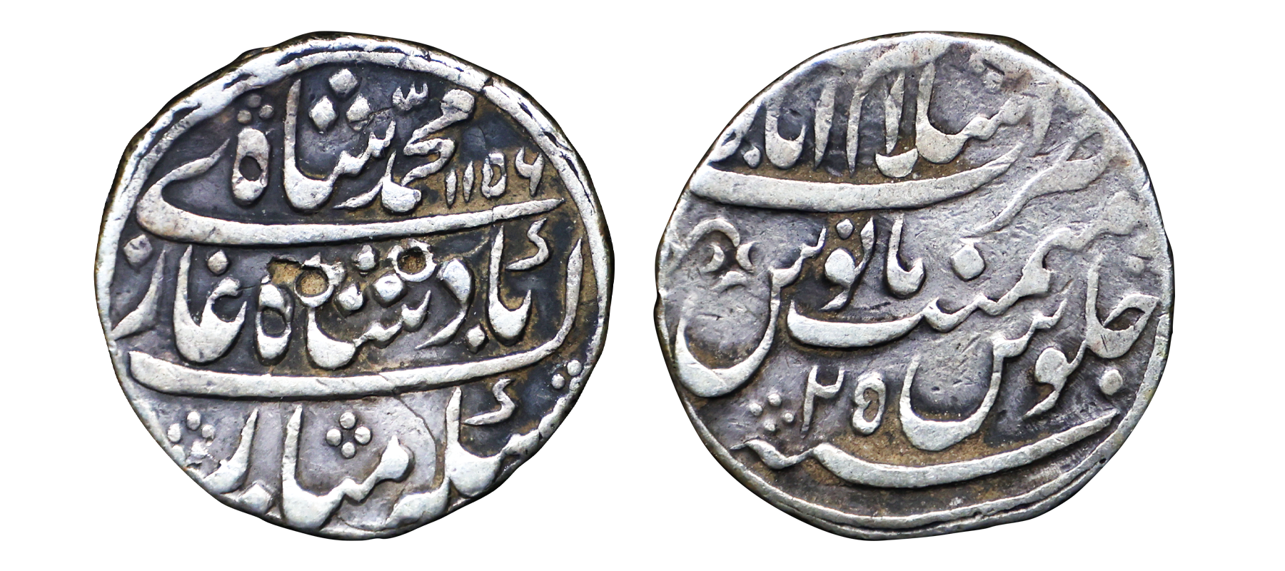Muhammad Shah (AH 1131-1161, 1719-1748 AD), Silver Rupee, 11.53 gms, Allahabad Mint, AH 1143, RY 13, Obv. Sikka mubarak Badshah Ghazi Muhammad Shah, Rev. sana julus maimanat manus zarb allahabad, KM # 436.6, very fine, scarce.