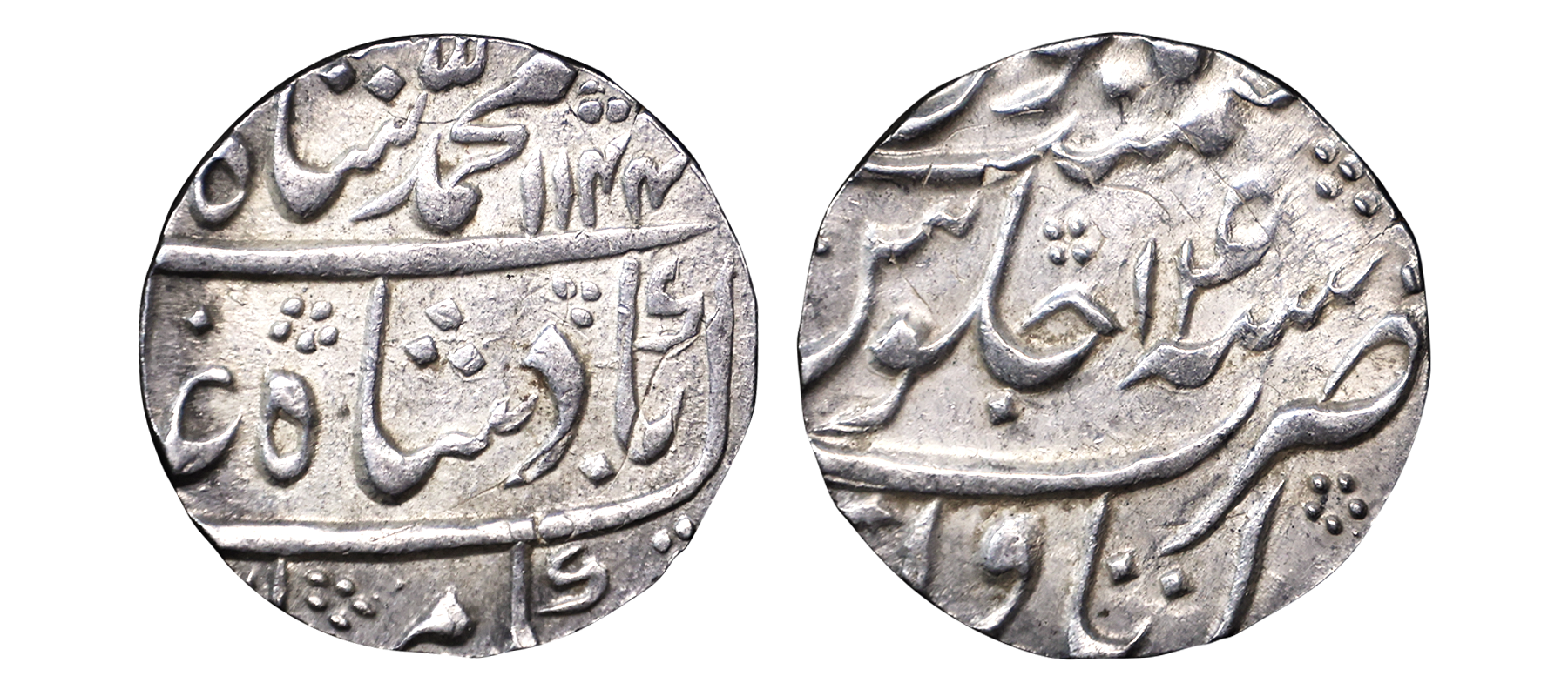 Muhammad Shah (AH 1131-1161, 1719-1748 AD), Silver Rupee, 11.53 gms, Allahabad Mint, AH 1143, RY 13, Obv. Sikka mubarak Badshah Ghazi Muhammad Shah, Rev. sana julus maimanat manus zarb allahabad, KM # 436.6, very fine, scarce.