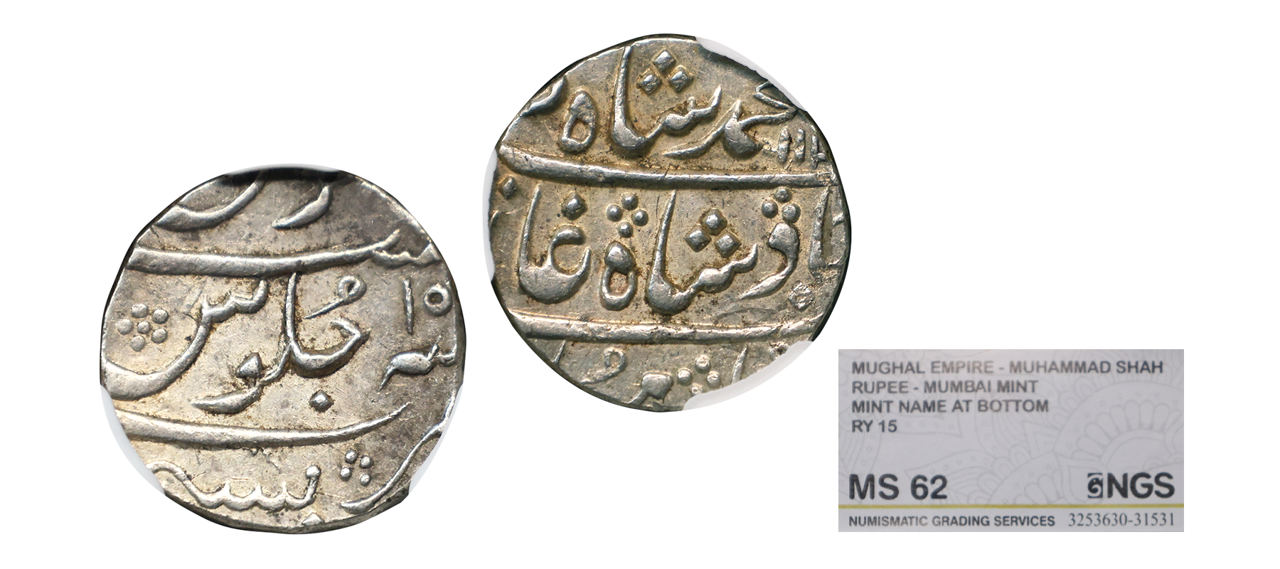 Muhammad Shah, Silver Rupee, Mumbai mint, AH 111X/ RY 15, the specimen features excellent strike with superb luster spread all over around and hints of little toning adding charm to the whole specimen, Graded By NGS MS62, Very Rare.