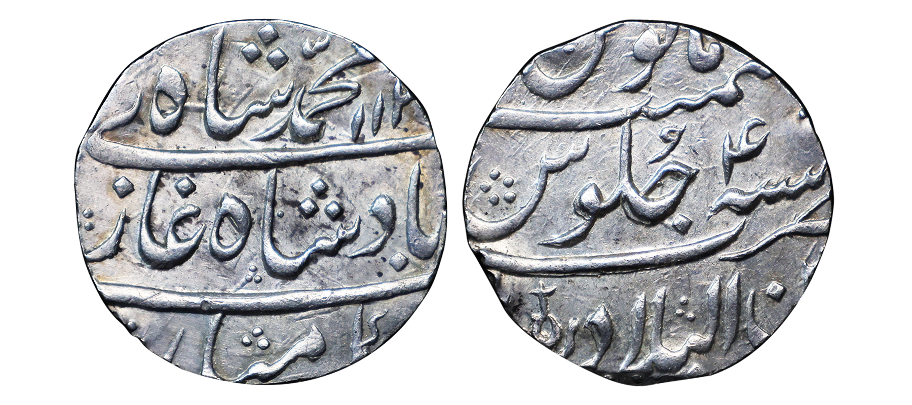 Muhammad Shah (AH 1131-1161, 1719-1748 AD), Gold Mohur, 10.90g gms, Dar-ul-Khilafat Shahjahanabad Mint, Saheb-e-qiran Couplet, RY 13, Obv. Sikka mubarak saheb-e-qiran sani Muhammad shah Badshah ghazi, Rev. sana julus maimanat manus zarb dar al khilfat Shahjahanabad, KM # 439.4, extremely fine, rare.