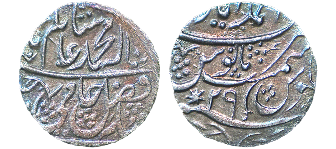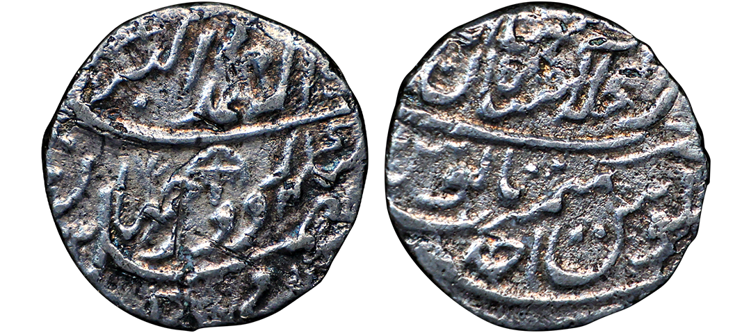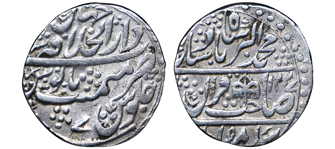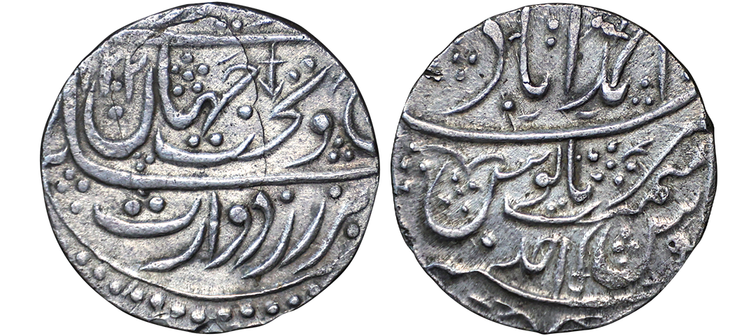 " /> 1202-1203/1788 AD), Silver Rupee, Ahmadabad Mint(Ghausgarh), AH 1202, RY Ahd, Obv. Ba-zar Zad Sikka Waris-i-Taj-wa- Takht Jahan Muhammad Shah Bedar Bakht, (struck coins on Gold, the heir to the crown and the throne, Bedar Bakht Muhammad Jahan Shah), Rev. Sana julus maimanat manus zarb Ahmadabad, sword as a mint mark on reverse, extremely fine, die crack on obverse, exceedingly rare, Note: In 1788 the emperor Shah Alam II was dethroned and blinded by Ghulam Qadir Rohilla, who then set up Bedar Bakht as emperor at Delhi in August 1788, but after about two months, the Maratha forces under Mahadji Scindia overthrew and killed Ghulam Qadir and reinstated Shah Alam II. Coins were struck for Bedar Bakht in the name of Shah Alam II at the mints of Shahjahanabad (Delhi) and an undetermined nearby location assigned the name Ahmadabad (Ghausgarh). Bedar Bakhat was the Mughal Emperor for this brief period in 1788 AD. He was allegedly put to death in 1790 by order of Shah Alam II, supposedly for usurping his authority in 1788. " />Lot No: 408