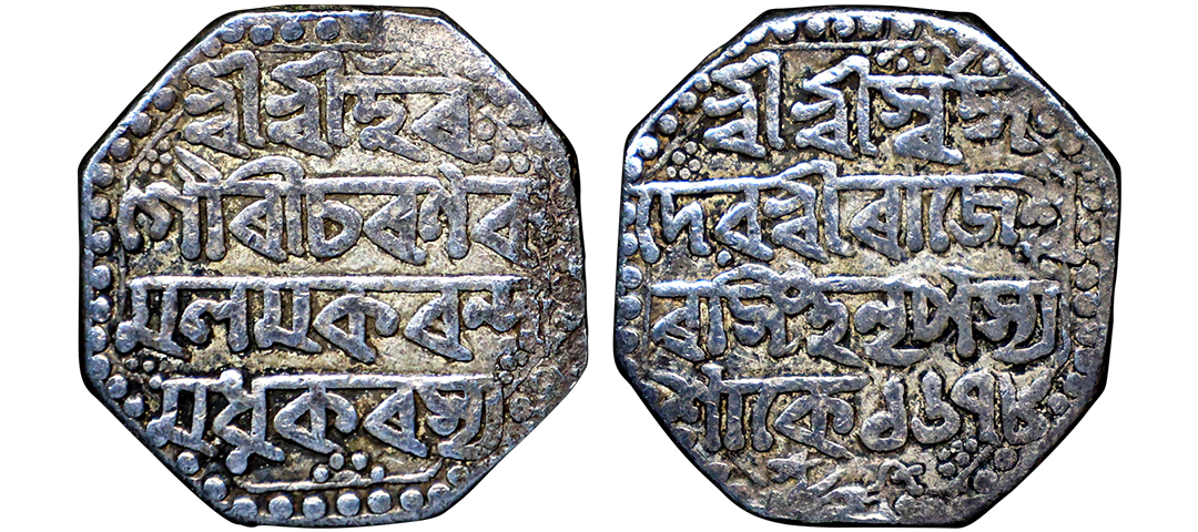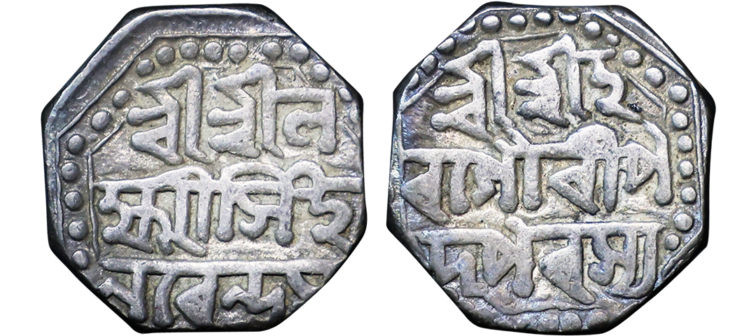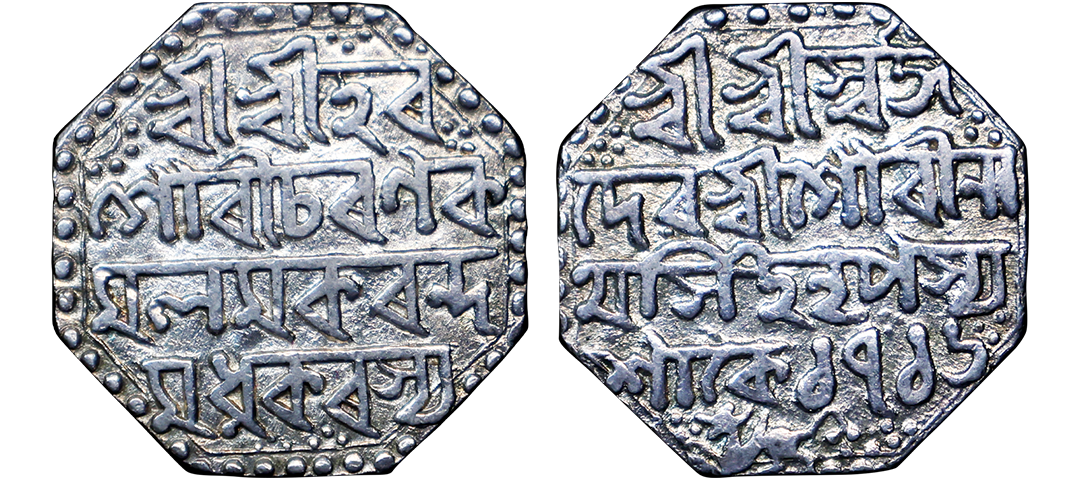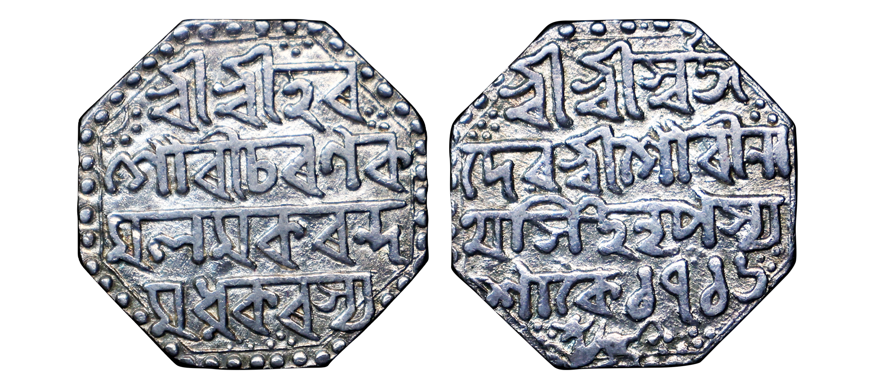 Assam, Rajeswar Simha or siu-rem-pha (1751-1769 AD), Silver ½ Rupee, 5.56 gms, Obv. Sri Sri Si/va Pada Para/yanasyan" Rev: "Sri Sri Ra/jesvara Simha/ Nripasya", 1st coin to be offered in any auction, other reference piece known in British Museum only,
