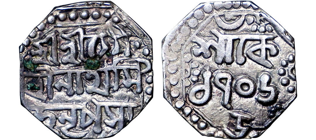 Assam, Rajesvara Simha (1751-1769 AD), silver rupee, sake 1677, 11.34g. Obv: Legend Sri Sri Hara/Gauri Charana Ka/mala Makaranda/Madhukarasya. Rev: Legend Sri Sri Svarga/Deva Sri Rajesva/ra Simha NrPasya/sake 1678, winged lion facing to left, both sides legend in four lines, R&B.O40.1.