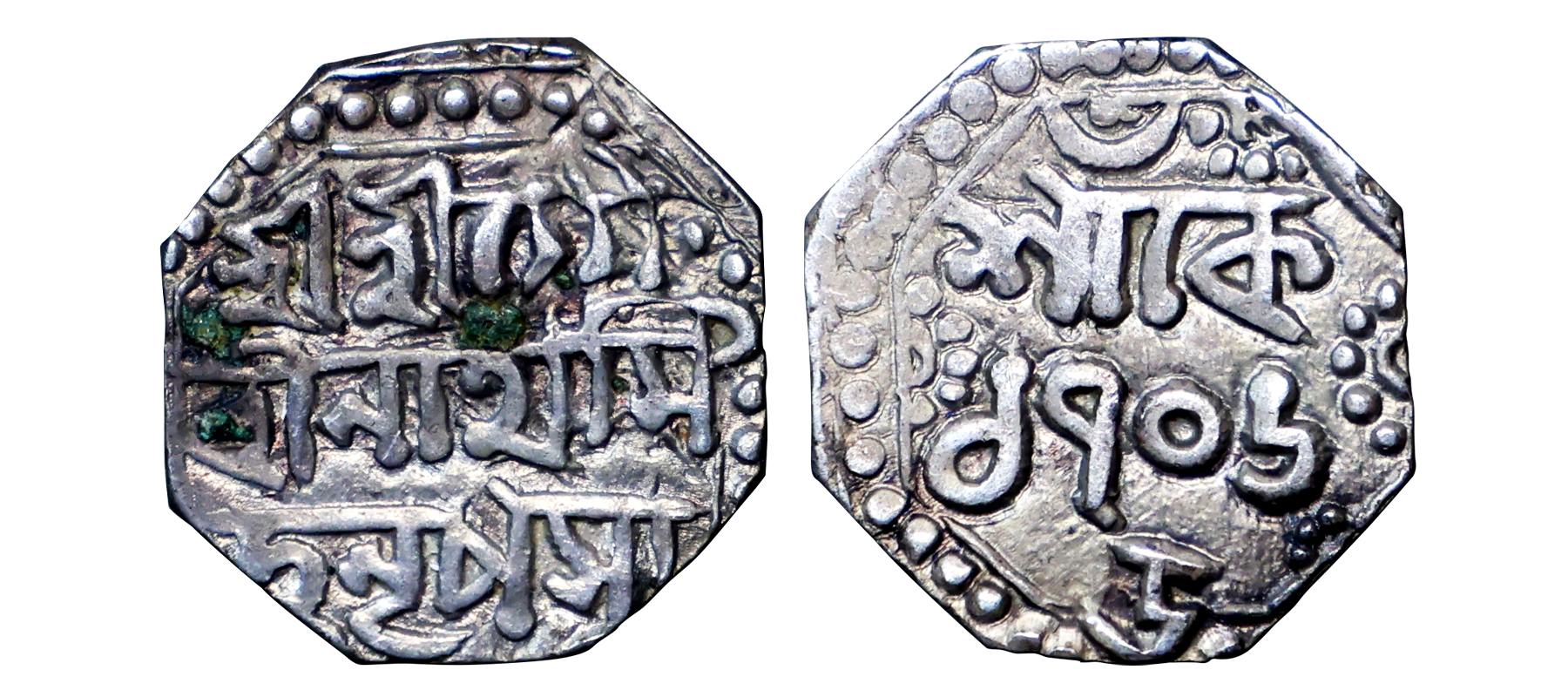 Assam, Rajesvara Simha (1751-1769 AD), silver rupee, sake 1677, 11.34g. Obv: Legend Sri Sri Hara/Gauri Charana Ka/mala Makaranda/Madhukarasya. Rev: Legend Sri Sri Svarga/Deva Sri Rajesva/ra Simha NrPasya/sake 1678, winged lion facing to left, both sides legend in four lines, R&B.O40.1.