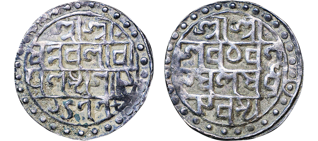 Assam, Gaurinatha Simha(SE 1702-1718 /1780-1796 AD), Silver ½ Rupee, 5.68 gms, Obv. Sri Sri Ha /ra Gauri Pa /da Parasy, Rev. Sri Sri Gau /ri Natha Simha /nrpasya, KM #213, very fine+, very scarce.