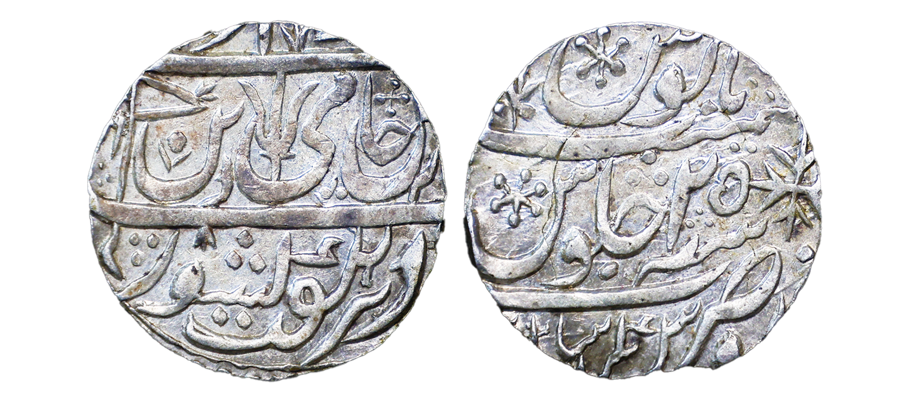 Maratha Confederacy, INO Shah Alam II (AH 1174-1221, 1759-1806 AD), Silver Rupee, 11.10 gms, Ravishnagar Sagar Mint, RY 25, ‘Blank-flag’ Type, Obv. sikka zad bar haft kishwar sayaye fazle elah, hami-e-dine mohammad, shah alam Badshah with blank flag and trident, Rev. manus mainamant sana julus zarb ravishnagar and star mark to right, Maheswari # T1, extremely fine, rare variety.