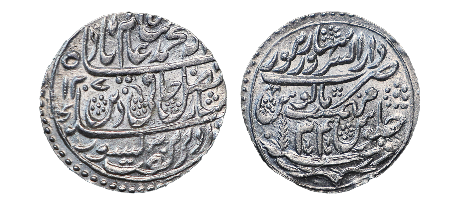 Maratha Confideracy, INO Shah Alam II (AH 1174-1221, 1759-1806 AD), Silver Rupee, 11.15 gms, Dar-ul-Sarur Saharanpur Mint, AH 1207, RY 34, KM #308, Brilliant Uncirculated, very scarce.