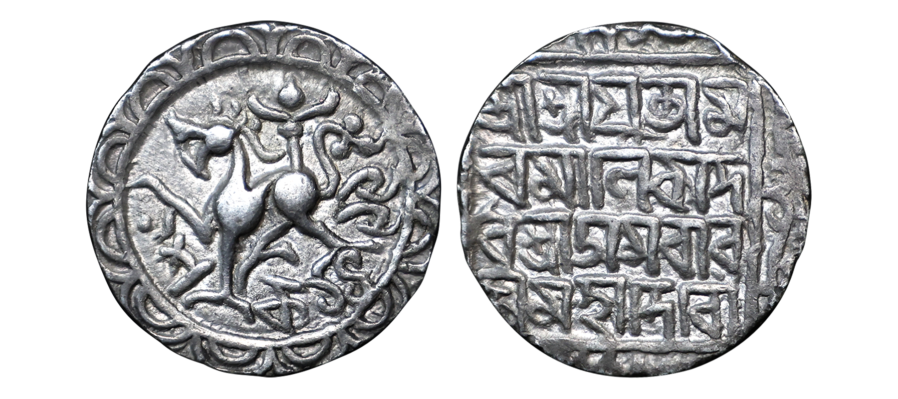 Tripura Kingdom, Amara Manikya (SE 1499-1508/1577-1586 AD), citing queen Amaravati, Silver Tanka, SE 1499. Obv. lion to left within border of rounded petals & date below, Rev. Sri Sri Yutama/ra Manikya De/va Sri Amarava/ti Maha Devayu, R&B 157, KM #90, extremely fine, rare.