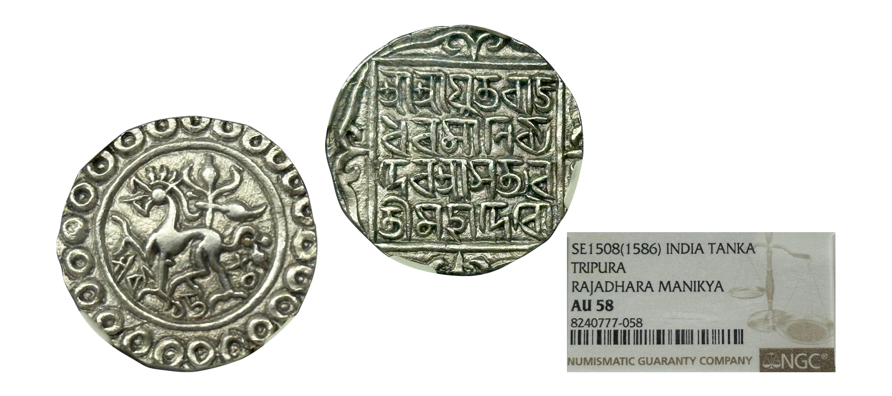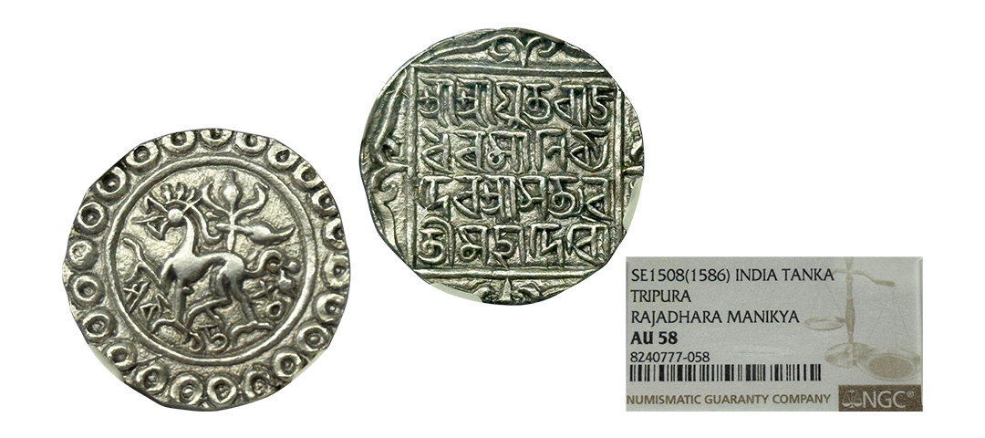 Tripura, Rajdhara Manikya (1586-1599 AD), silver tanka, SE 1508. Obv: Lion facing left. Rev: Bangla legend Sri Sri Yuta Raja/dhara Manikya De/va Sri Satyava/ti Maha Devyau in square, R&B T-182-187. graded by NGC AU58, Bold Strike, Extremely Rare in Grade