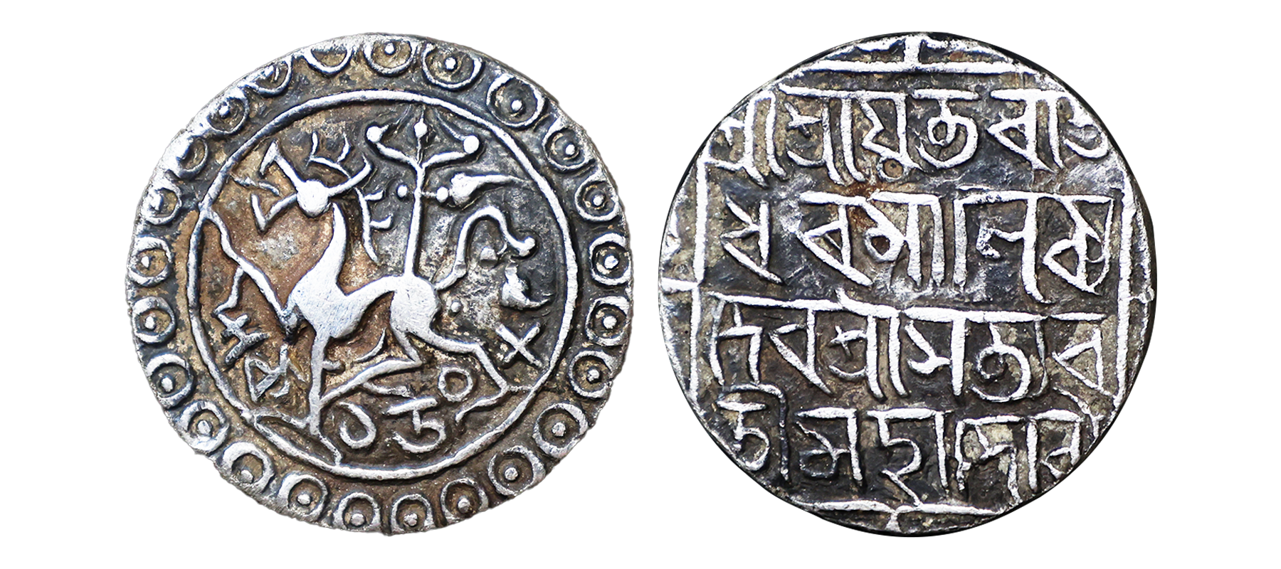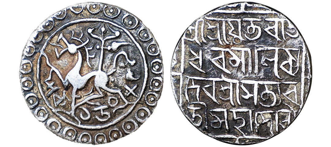Tripura, Rajdhara Manikya (1586-1599 AD), silver tanka, SE 1508. Obv: Lion facing left. Rev: Bangla legend Sri Sri Yuta Raja/dhara Manikya De/va Sri Satyava/ti Maha Devyau in square, R&B T-182-187.Extremely Fine, Rare.