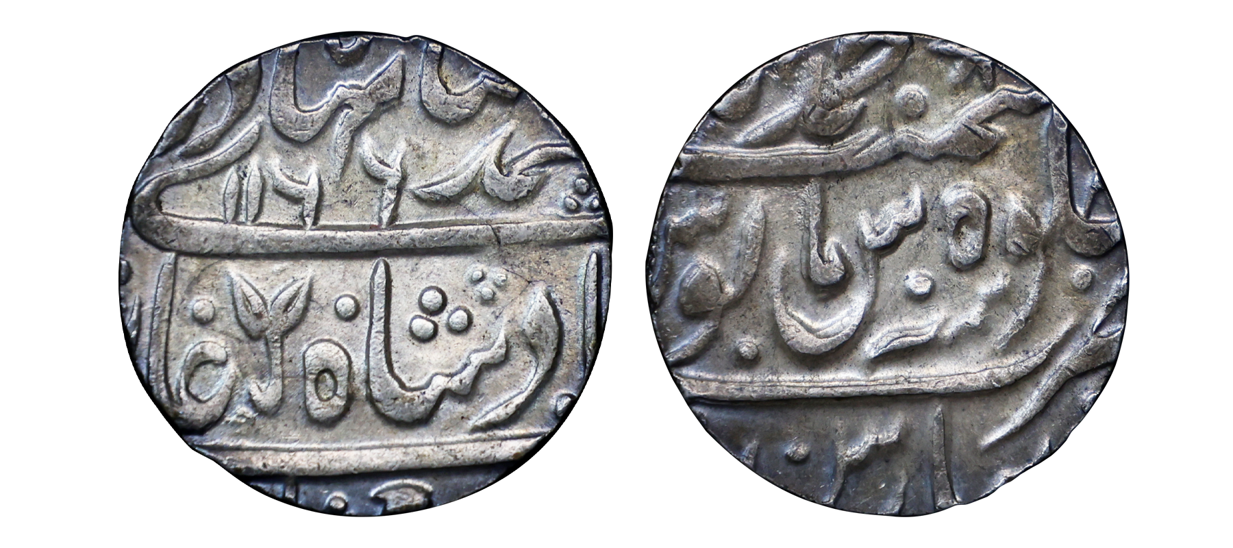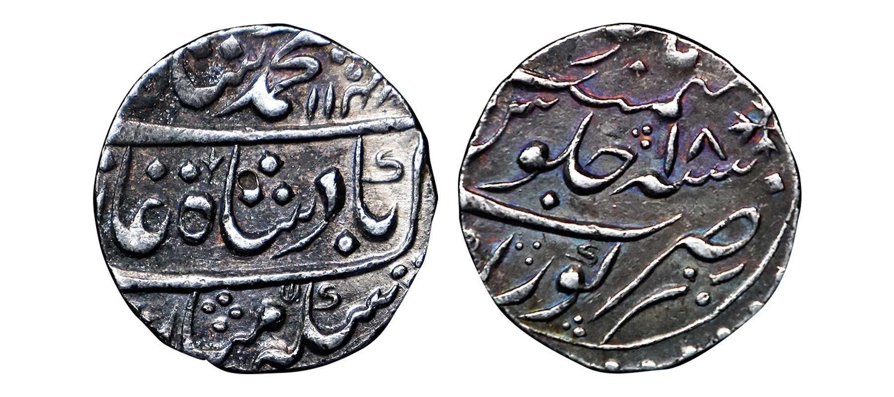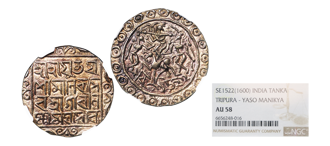 Tripura, Yaso Manikya (1599-1600 AD), Silver Tanka, "Krishna-Gopi Type", Saka 1522, Obverse: Krishna Playing Flute upon Lion facing left, standard above, date below Saka 1522, within circle with outer border of beaded annulets. Reverse: “Sri Sri Yuta Ja/so Manikya De /va Sri Gauri La /kshmi Maha Devyah” in square with ornamented border (R&B# 189). Graded AU58 by NGC, Extremely Rare in Grade a very pouplar coin.