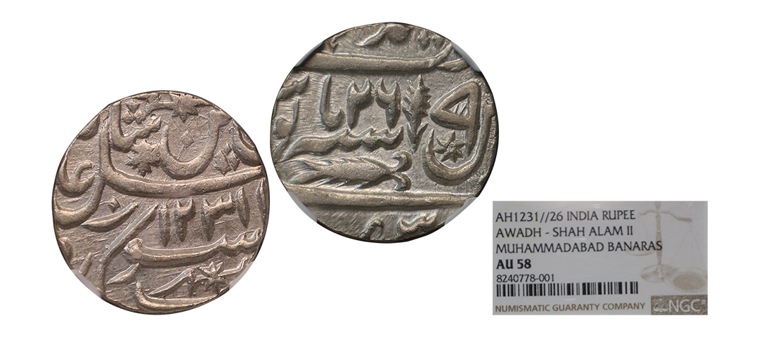 Awadh State, Safdar Jung (AH 1151-1167, 1739-1754 AD), INO Ahmad Shah Bahadur (AH 1161-1167, 1748-1754 AD), Silver Rupee, 11.32 gms, Muhammadabad Banaras Mint, AH 1166, RY 6, Unlisted in KM, Kapoor & Master Ref 2.49, very fine, very scarce.