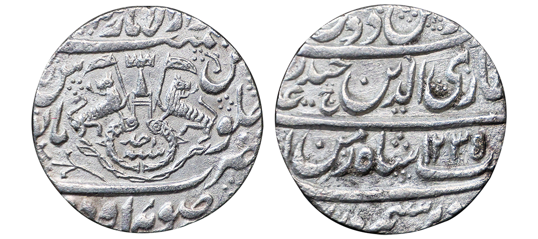 Awadh State, Safdar Jung (AH 1151-1167, 1739-1754 AD), INO Ahmad Shah Bahadur (AH 1161-1167, 1748-1754 AD), Silver Rupee, 11.32 gms, Muhammadabad Banaras Mint, AH 1166, RY 6, Unlisted in KM, Kapoor & Master Ref 2.49, very fine, very scarce.