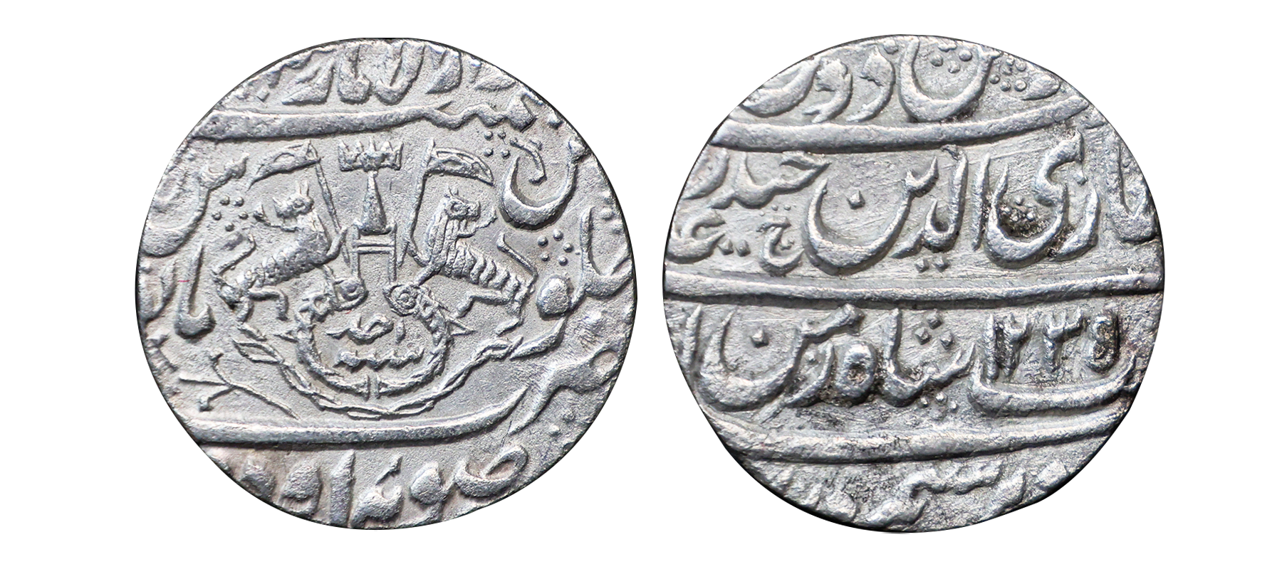 Awadh State, Safdar Jung (AH 1151-1167, 1739-1754 AD), INO Ahmad Shah Bahadur (AH 1161-1167, 1748-1754 AD), Silver Rupee, 11.32 gms, Muhammadabad Banaras Mint, AH 1166, RY 6, Unlisted in KM, Kapoor & Master Ref 2.49, very fine, very scarce.