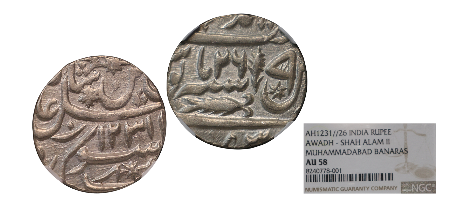 Awadh State, Safdar Jung (AH 1151-1167, 1739-1754 AD), INO Ahmad Shah Bahadur (AH 1161-1167, 1748-1754 AD), Silver Rupee, 11.32 gms, Muhammadabad Banaras Mint, AH 1166, RY 6, Unlisted in KM, Kapoor & Master Ref 2.49, very fine, very scarce.