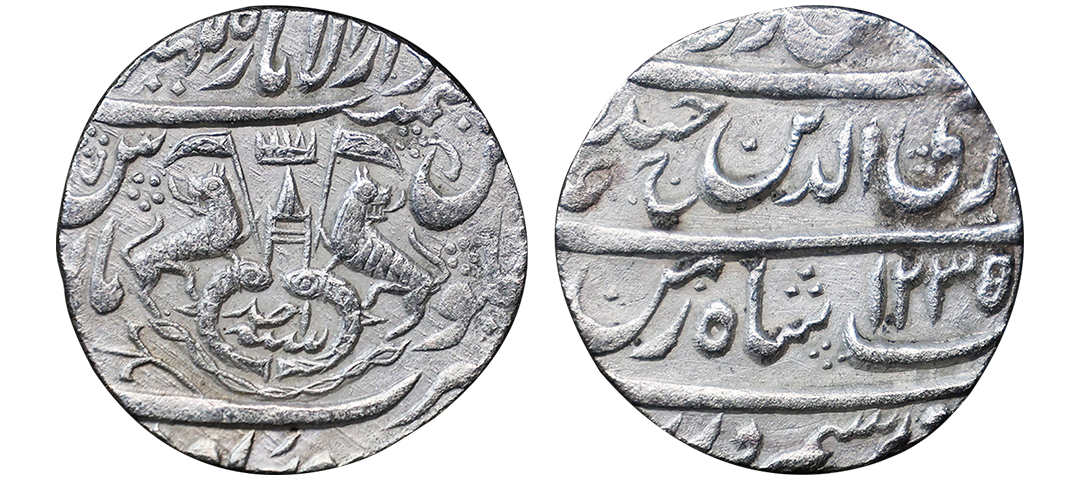 Awadh State, Asaf-ud-daula (AH 1188-1212 /1775-1797 AD), INO Shah Alam II, Silver Rupee, 11.04 gms, Itawa Mint, RY 25, Obv. sikka mubarak Badshah Ghazi Shah Alam. With & chattra(slightly visible) symbol, Rev. manus maimanat sana julus zarb Itawa, KM #76.4, Kapoor & Master #4.80, very fine, scarce.