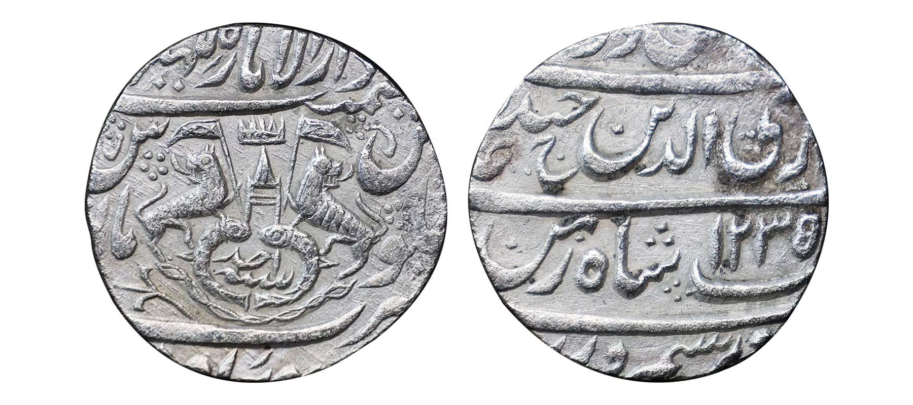 Awadh, Ghazi ud-din Haidar as Nawab (AH 1229-1234/1814-1819 AD), Muhammadabad Banaras, Silver Rupee, AH 1231/26 RY, "Saya-e-fazle Elah" Couplet, In the name of Shah Alam II, Obv: Persian legend "sikka zad bar haft kishwar saya e fazle elah, Hami din-e-Muhammad, Shah Alam Badshah" with 1231 Hijri year, Rev: Persian legend "sana 26 julus", "zarb Muhammadabad Banaras", flower, star & fish symbols, (KM# 103.2/MK #7.07), graded by NGC as AU 58.