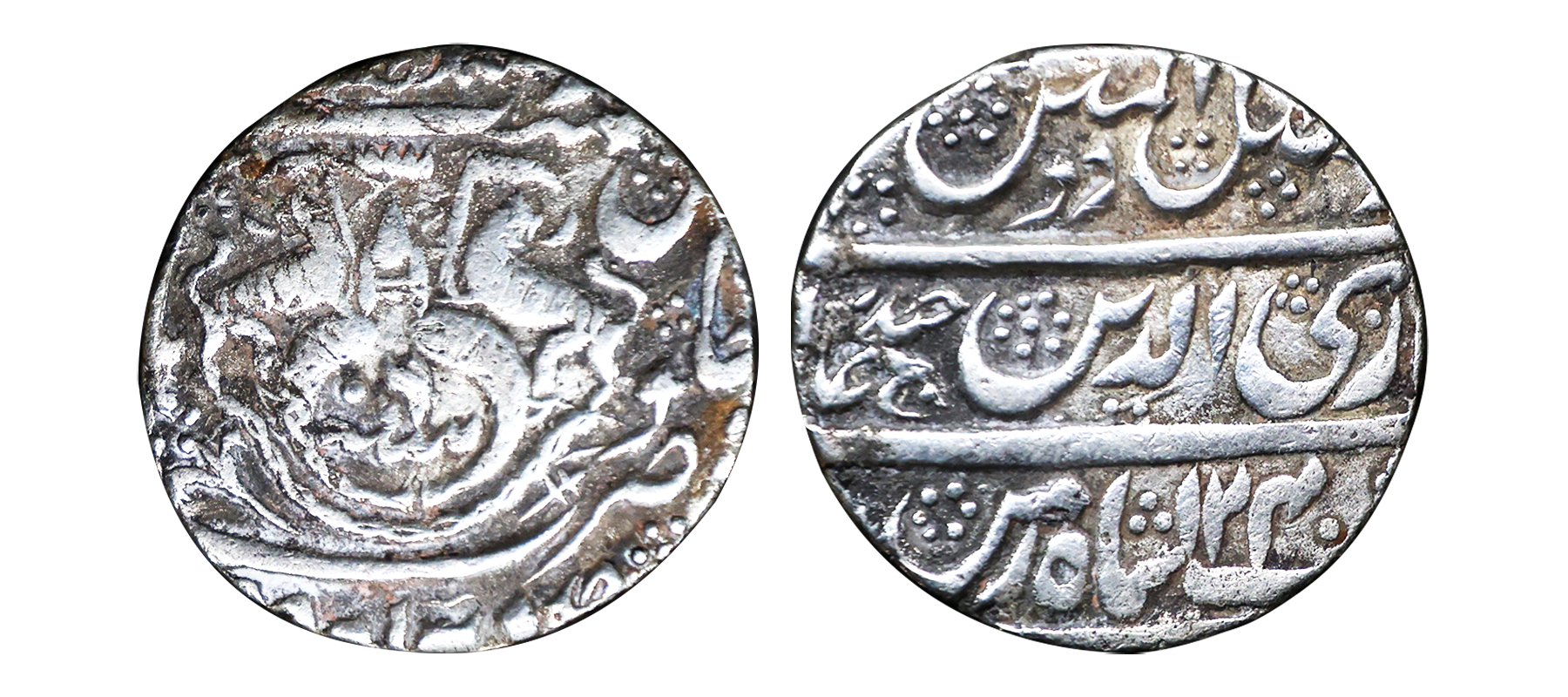 Awadh, Ghazi ud-din Haidar as Nawab (AH 1229-1234/1814-1819 AD), Muhammadabad Banaras, Silver Rupee, AH 1231/26 RY, "Saya-e-fazle Elah" Couplet, In the name of Shah Alam II, Obv: Persian legend "sikka zad bar haft kishwar saya e fazle elah, Hami din-e-Muhammad, Shah Alam Badshah" with 1231 Hijri year, Rev: Persian legend "sana 26 julus", "zarb Muhammadabad Banaras", flower, star & fish symbols, (KM# 103.2/MK #7.07), graded by NGC as AU 58.