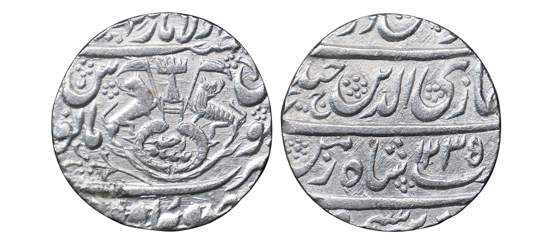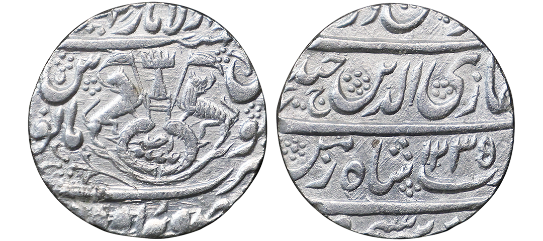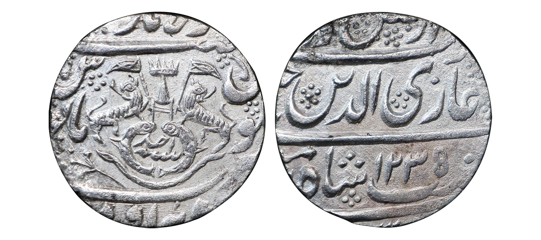 Awadh State, Ghazi-ud-din Haider (AH 1230-1243, 1819-1827 AD), Silver Rupee, 10.82 gms, Dar al-Saltanat Suba Awadh Lakhnau Mint, AH 1240, RY 6, Obv. sikka zad bar seem wa zad az fazle rab zulmenan, Ghazi-ud-din haider ali nasab shah-e-zaman, Rev. crown flanked by rampant lions holding Flag, two upright fish below, zarb Suba Awadh at the bottom Dar-al-Saltanat Lakhnau at the top, KM # 165.2, very fine, very scarce.