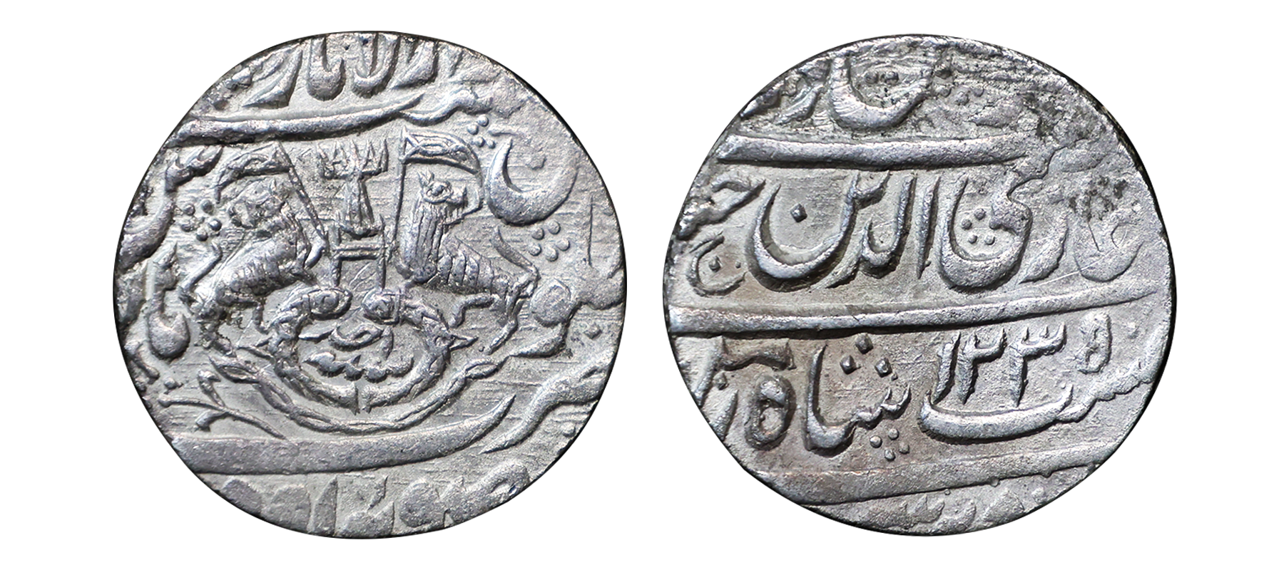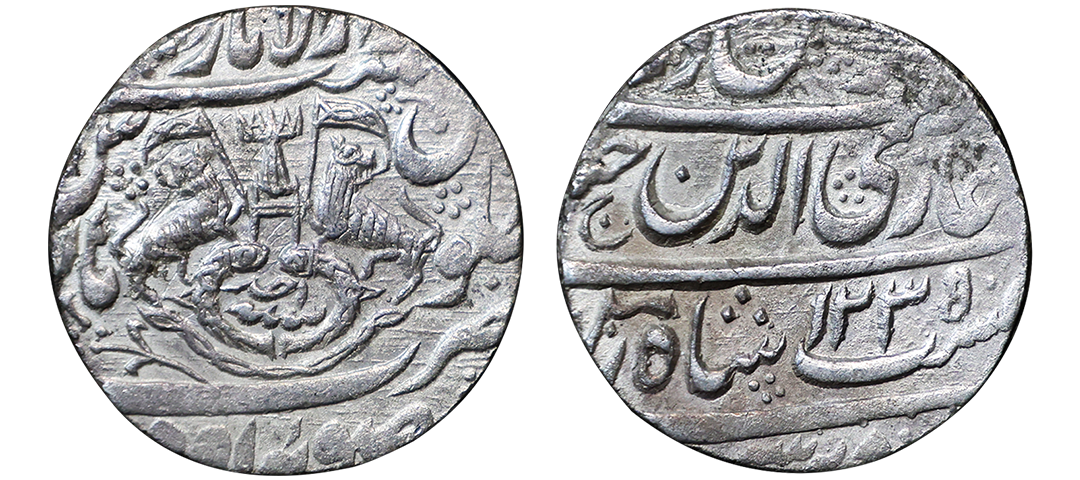 Awadh State, Ghazi-ud-din Haider (AH 1230-1243, 1819-1827 AD), Silver Rupee, 10.84 gms, Dar al-Amaret Suba Awadh Lakhnau Mint, AH 1235, RY Ahd, Obv. sikka zad bar seem wa zad az fazle rab zulmenan, Ghazi-ud-din haider ali nasab shah-e-zaman, Rev. crown flanked by rampant lions holding Flag, two upright fish below, zarb Suba Awadh at the bottom Dar-ul-Amara Lakhnau at the top, KM # 165.1, very fine+, very scarce.