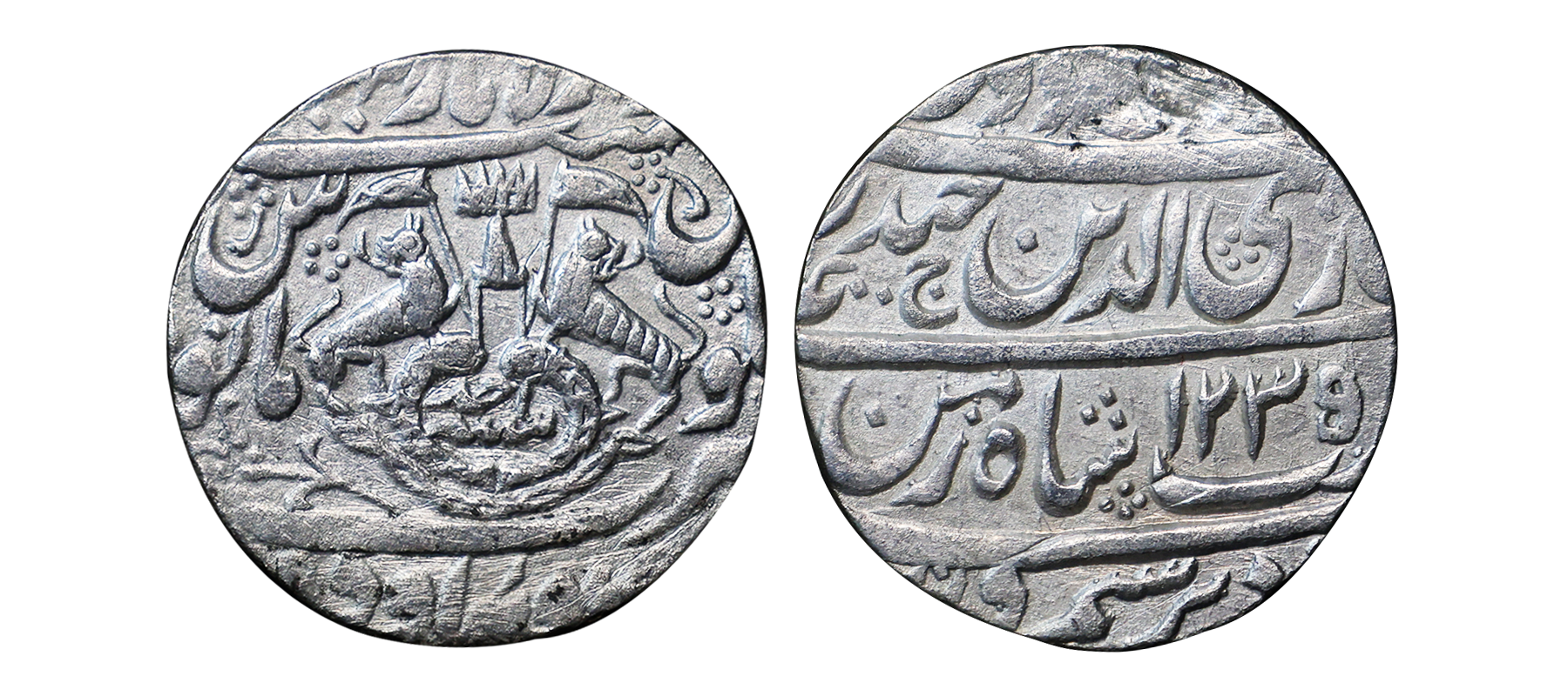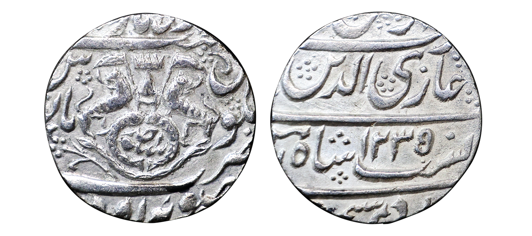 Awadh State, Ghazi-ud-din Haider (AH 1230-1243, 1819-1827 AD), Silver Rupee, 10.88 gms, Dar al-Amaret Suba Awadh Lakhnau Mint, AH 1235, RY Ahd, Obv. sikka zad bar seem wa zad az fazle rab zulmenan, Ghazi-ud-din haider ali nasab shah-e-zaman, Rev. crown flanked by rampant lions holding Flag, two upright fish below, zarb Suba Awadh at the bottom Dar-ul-Amara Lakhnau at the top, KM # 165.1, very fine+, very scarce.