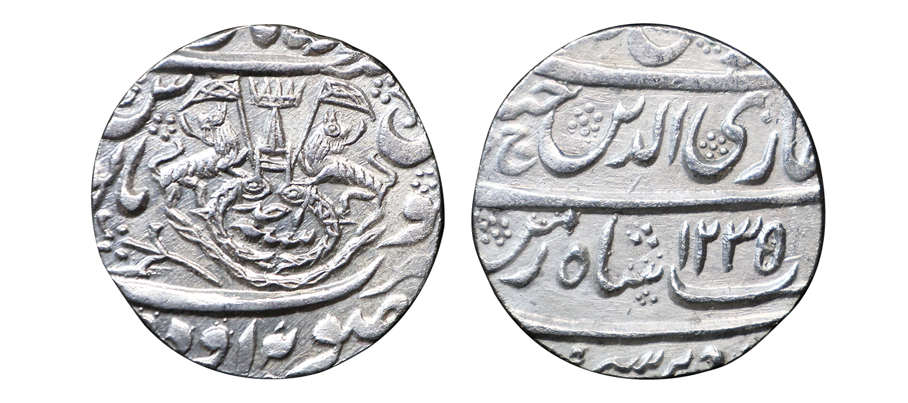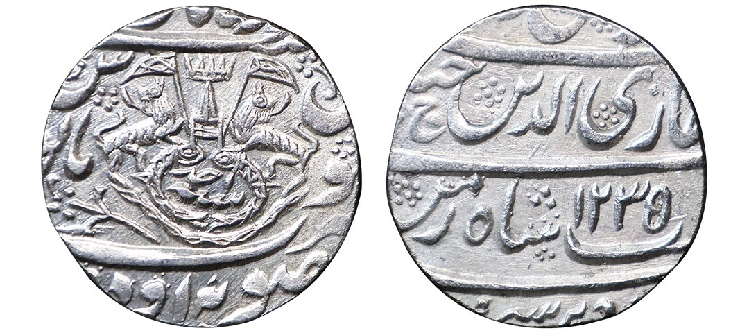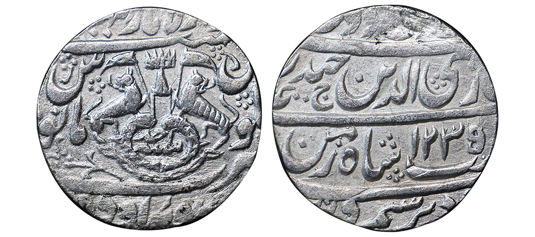 Awadh State, Ghazi-ud-din Haider (AH 1230-1243, 1819-1827 AD), Silver Rupee, 10.89 gms, Dar al-Amaret Suba Awadh Lakhnau Mint, AH 1235, RY Ahd, Obv. sikka zad bar seem wa zad az fazle rab zulmenan, Ghazi-ud-din haider ali nasab shah-e-zaman, Rev. crown flanked by rampant lions holding Flag, two upright fish below, zarb Suba Awadh at the bottom Dar-ul-Amara Lakhnau at the top, KM # 165.1, very fine+, very scarce.