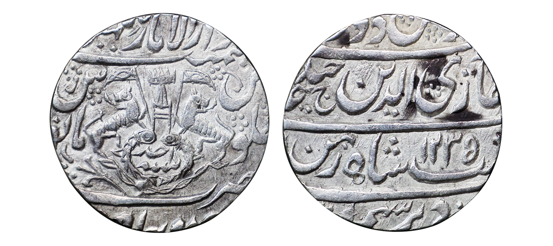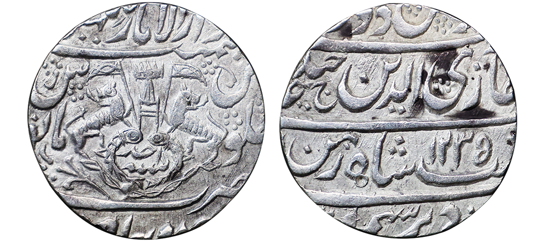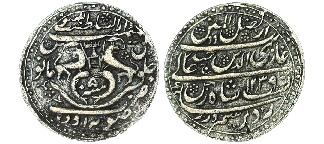 Awadh State, Ghazi-ud-din Haider (AH 1230-1243, 1819-1827 AD), Silver Rupee, 10.99 gms, Dar al-Saltanat Lakhnau Suba Awadh Mint, AH 1238, RY 4, Obv. sikka zad bar seem wa zad az fazle rab zulmenan, Ghazi-ud-din haider ali nasab shah-e-zaman, Rev. crown flanked by rampant lions holding Flag, two upright fish below, zarb Suba Awadh at the bottom Dar-al-Saltanat Lakhnau at the top, KM # 165.2, very fine, very scarce.