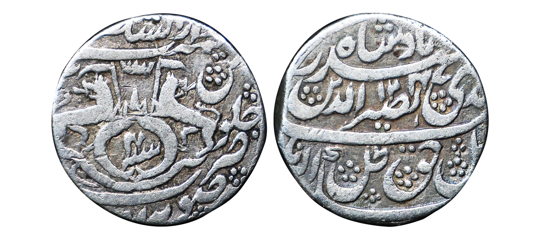 Awadh State, Ghazi-ud-din Haider (AH 1230-1243, 1819-1827 AD), Silver Rupee, 11.05 gms, Dar al-Amaret Suba Awadh Lakhnau Mint, AH 1235, RY Ahd, Obv. sikka zad bar seem wa zad az fazle rab zulmenan, Ghazi-ud-din haider ali nasab shah-e-zaman, Rev. crown flanked by rampant lions holding Flag, two upright fish below, zarb Suba Awadh at the bottom Dar-ul-Amara Lakhnau at the top, KM # 165.1, very fine+, very scarce.