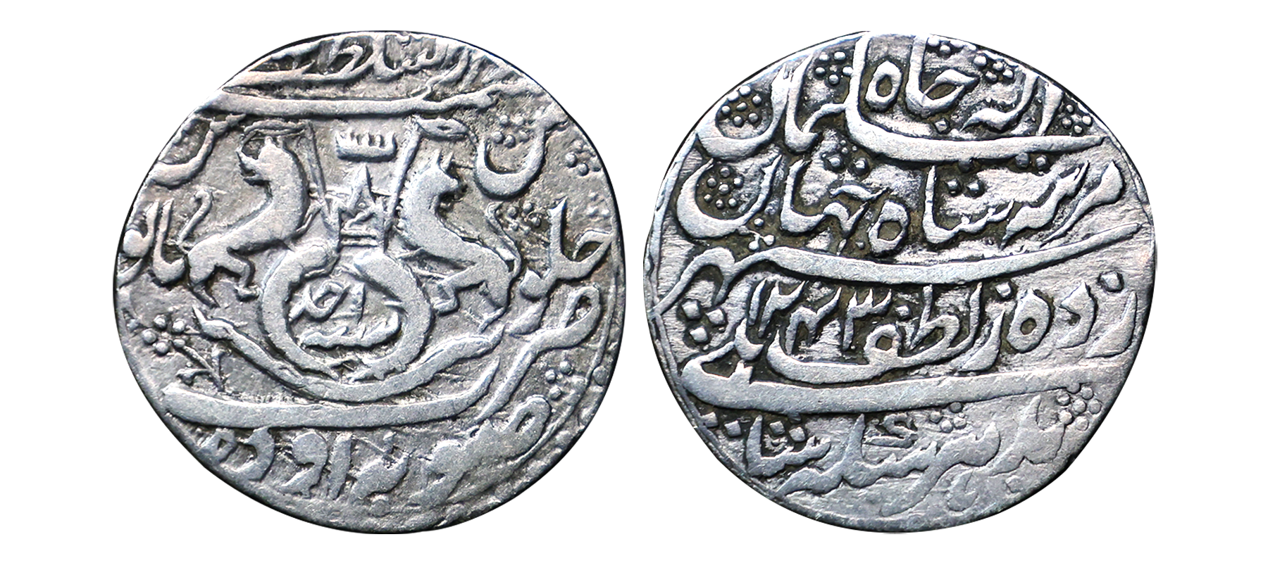 Awadh State, Nasir-ud-Din Haider (AH 1243-1253, 1827-1837 AD), Silver Rupee, 10.98 gms, Dar al-Sultanat Lakhnau Suba Awadh Mint, AH 1243, RY Ahd, Obv.bad har sikka shah-e-zaada ze lutf pehar martaba shah jahan ilah sulaiman jah, Rev. crown flanked by rampant lions holding Flag, two upright fish below, zarb Suba Awadh at the bottom Dar-al-saltanat Lakhnau at the top, KM # 186, very fine+, very scarce.