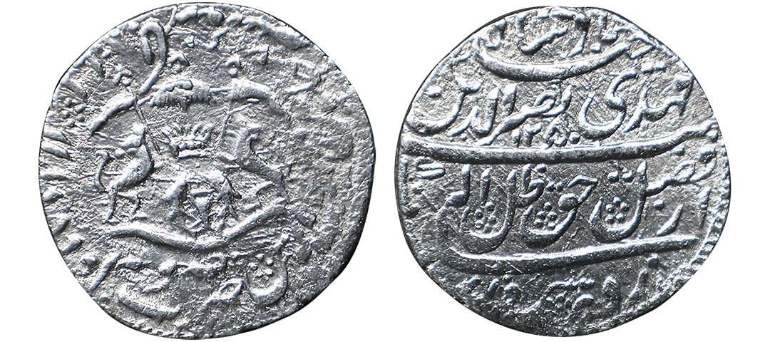 Awadh State, Nasir-ud-Din Haider (AH 1243-1253, 1827-1837 AD), Silver Rupee, 10.98 gms, Dar al-Sultanat Lakhnau Suba Awadh Mint, AH 1250, RY 7, Obv. sikka zad bar seem wa zad az fazl-e-haque zulle nayab mehdi Naseer-ud-din haider Badshah, Rev. crown flanked by rampant lions holding Flag, two upright fish below, zarb Suba Awadh Dar-al-Saltanat Lakhnau, KM # 205.2, very fine+, very scarce.