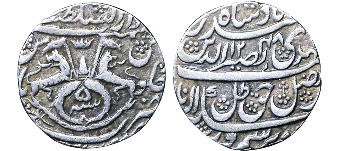 Awadh State, Nasir-ud-Din Haider (AH 1243-1253, 1827-1837 AD), Silver Rupee, 11.07 gms, Dar al-Sultanat Lakhnau Suba Awadh Mint, AH 1248, RY 5, Obv. sikka zad bar seem wa zad az fazl-e-haque zulle nayab mehdi Naseer-ud-din haider Badshah, Rev. crown flanked by rampant lions holding Flag, two upright fish below, zarb Suba Awadh at the bottom Dar-al-saltanat Lakhnau at the top, KM # 205.1, very fine+, very scarce.