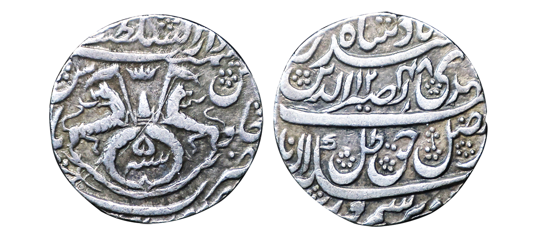 Awadh State, Nasir-ud-Din Haider (AH 1243-1253, 1827-1837 AD), Silver Rupee, 11.07 gms, Dar al-Sultanat Lakhnau Suba Awadh Mint, AH 1248, RY 5, Obv. sikka zad bar seem wa zad az fazl-e-haque zulle nayab mehdi Naseer-ud-din haider Badshah, Rev. crown flanked by rampant lions holding Flag, two upright fish below, zarb Suba Awadh at the bottom Dar-al-saltanat Lakhnau at the top, KM # 205.1, very fine+, very scarce.