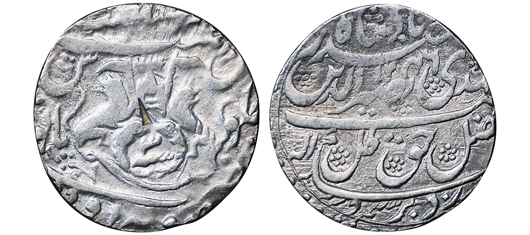 Awadh State, Nasir-ud-Din Haider (AH 1243-1253, 1827-1837 AD), Silver Rupee, 11.11 gms, Dar al-Sultanat Lakhnau Suba Awadh Mint, AH 1246, RY 3, Obv. sikka zad bar seem wa zad az fazl-e-haque zulle nayab mehdi Naseer-ud-din haider Badshah, Rev. crown flanked by rampant lions holding Flag, two upright fish below, zarb Suba Awadh at the bottom Dar-al-saltanat Lakhnau at the top, KM # 205.1, very fine, very scarce.
