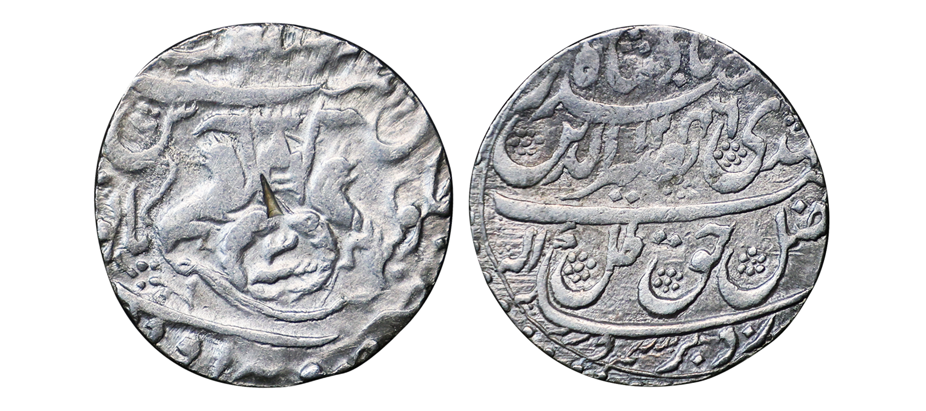 Awadh State, Nasir-ud-Din Haider (AH 1243-1253, 1827-1837 AD), Silver Rupee, 11.11 gms, Dar al-Sultanat Lakhnau Suba Awadh Mint, AH 1246, RY 3, Obv. sikka zad bar seem wa zad az fazl-e-haque zulle nayab mehdi Naseer-ud-din haider Badshah, Rev. crown flanked by rampant lions holding Flag, two upright fish below, zarb Suba Awadh at the bottom Dar-al-saltanat Lakhnau at the top, KM # 205.1, very fine, very scarce.