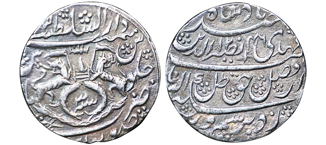 Awadh State, Nasir-ud-Din Haider (AH 1243-1253, 1827-1837 AD), Silver Rupee, 11.11 gms, Dar al-Sultanat Lakhnau Suba Awadh Mint, AH 1246, RY 3, Obv. sikka zad bar seem wa zad az fazl-e-haque zulle nayab mehdi Naseer-ud-din haider Badshah, Rev. crown flanked by rampant lions holding Flag, two upright fish below, zarb Suba Awadh at the bottom Dar-al-sultanat Lakhnau at the top, KM # 205.1, very fine, very scarce.