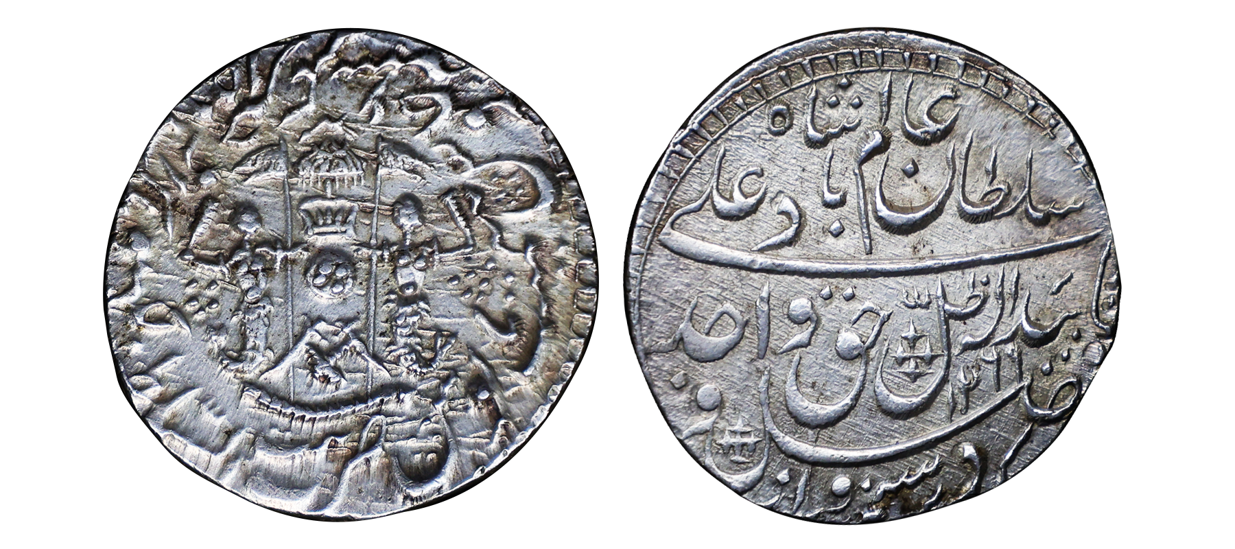 Awadh State, Wajid Ali Shah (AH 1263-1272, 1847-1856 AD), Silver Nazarana Rupee, Bait-us-Sultanat Lakhnau Mulk Awadh Akhtarnagar Mint, AH 1272, RY 10, Obv. sikka zad bar sim-o-zar az fazl wa tayid elah, zille haque Wajid Ali sultan-e-alam panah, Rev. parasol above the crown, flanked by mermaids holding a flag, with a crossed sword below, zarb Baitus Sultanat Lakhnau Mulk Awadh Akhtarnagar sana 10 julus maimenat manus, Mint Variety VI, KM # 365.3, Kapoor & Master #11.79, Graded by NGC as MS61, extremely rare.