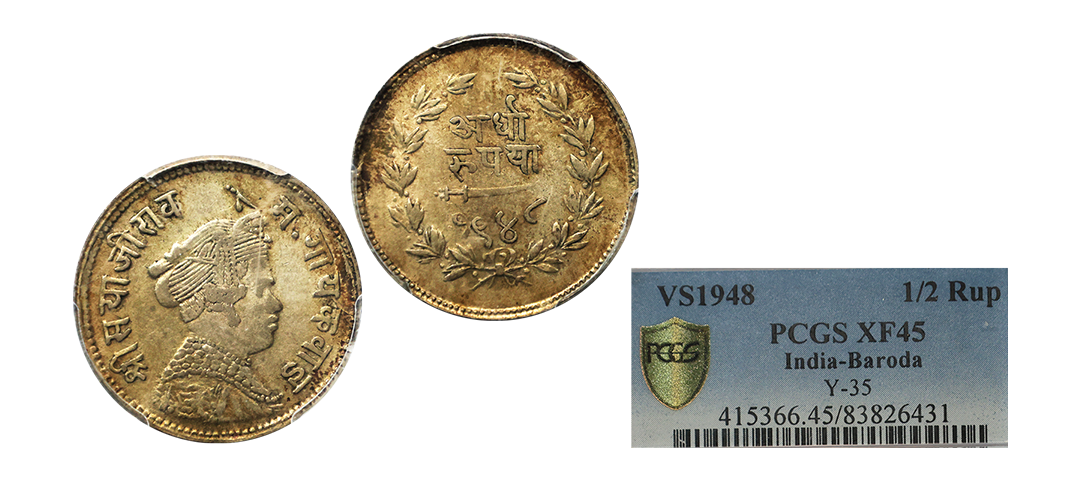 Baroda State, Sayaji Rao III (VS 1932-1995 / 1875-1938 AD), Silver ½ Rupee, VS 1948, Portrait of Sayaji Rao III facing to right side. (KM # Y35). Garded by PCGS XF45.