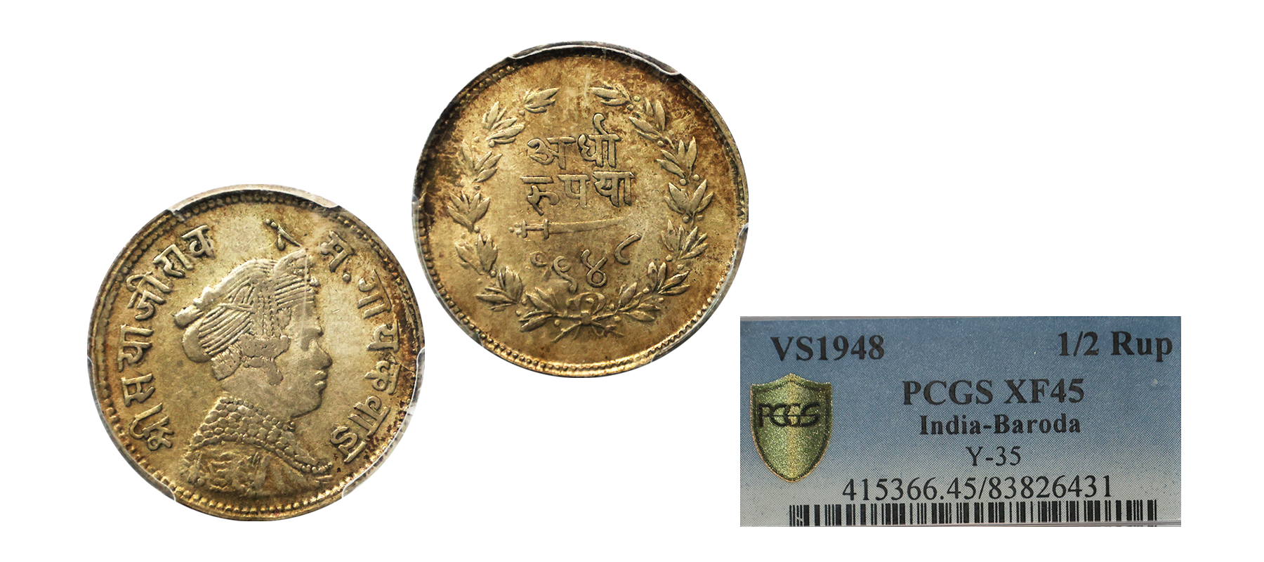 Baroda State, Sayaji Rao III (VS 1932-1995 / 1875-1938 AD), Silver ½ Rupee, VS 1948, Portrait of Sayaji Rao III facing to right side. (KM # Y35). Garded by PCGS XF45.