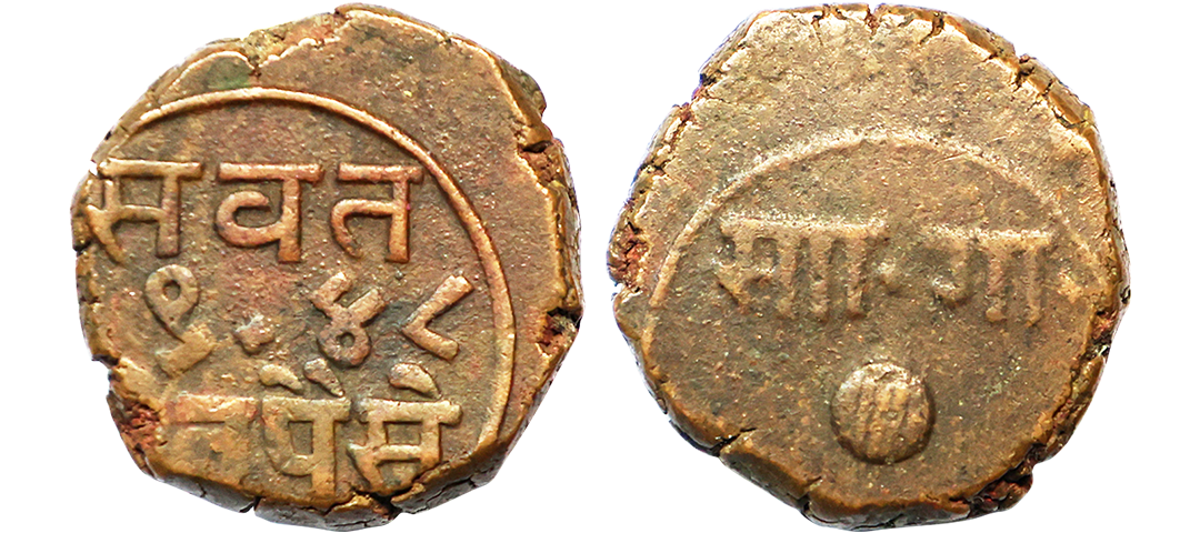 Baroda State, Sayaji Rao III (VS 1932-1995 / 1875-1938 AD), Copper 2 Paisa/Paisa, This is 2 paisa struck in the weight of 1 paisa, 7.77g, VS 1948, Obv: Nagari letter ‘Sa’ and ‘Ga’ with scimitar and shaded ball, Rev: Value and year. (KM # Y24).