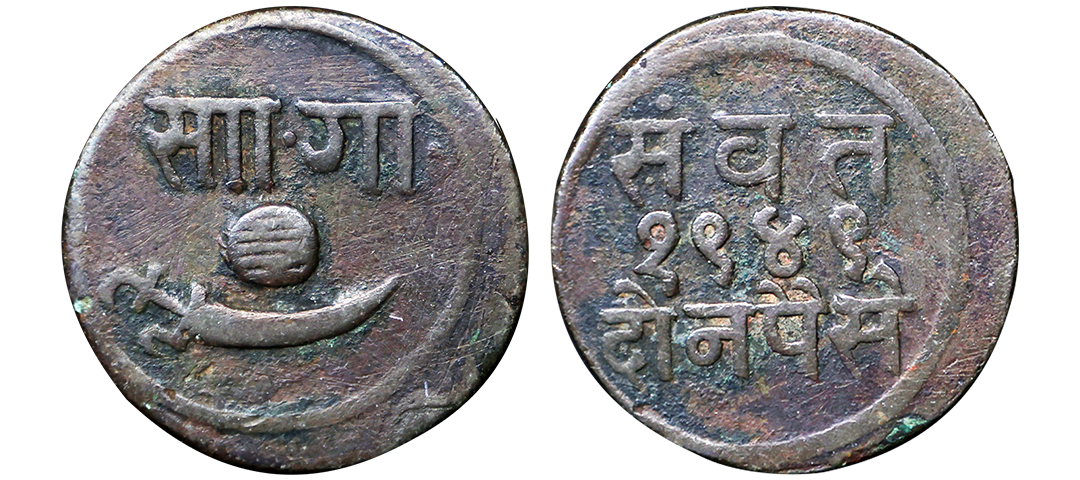 Baroda State, Sayaji Rao III (VS 1932-1995 / 1875-1938 AD), Copper 2 Paisa/Paisa, This is 2 paisa struck in the weight of 1 paisa, 7.77g, VS 1948, Obv: Nagari letter ‘Sa’ and ‘Ga’ with scimitar and shaded ball, Rev: Value and year. (KM # Y24).