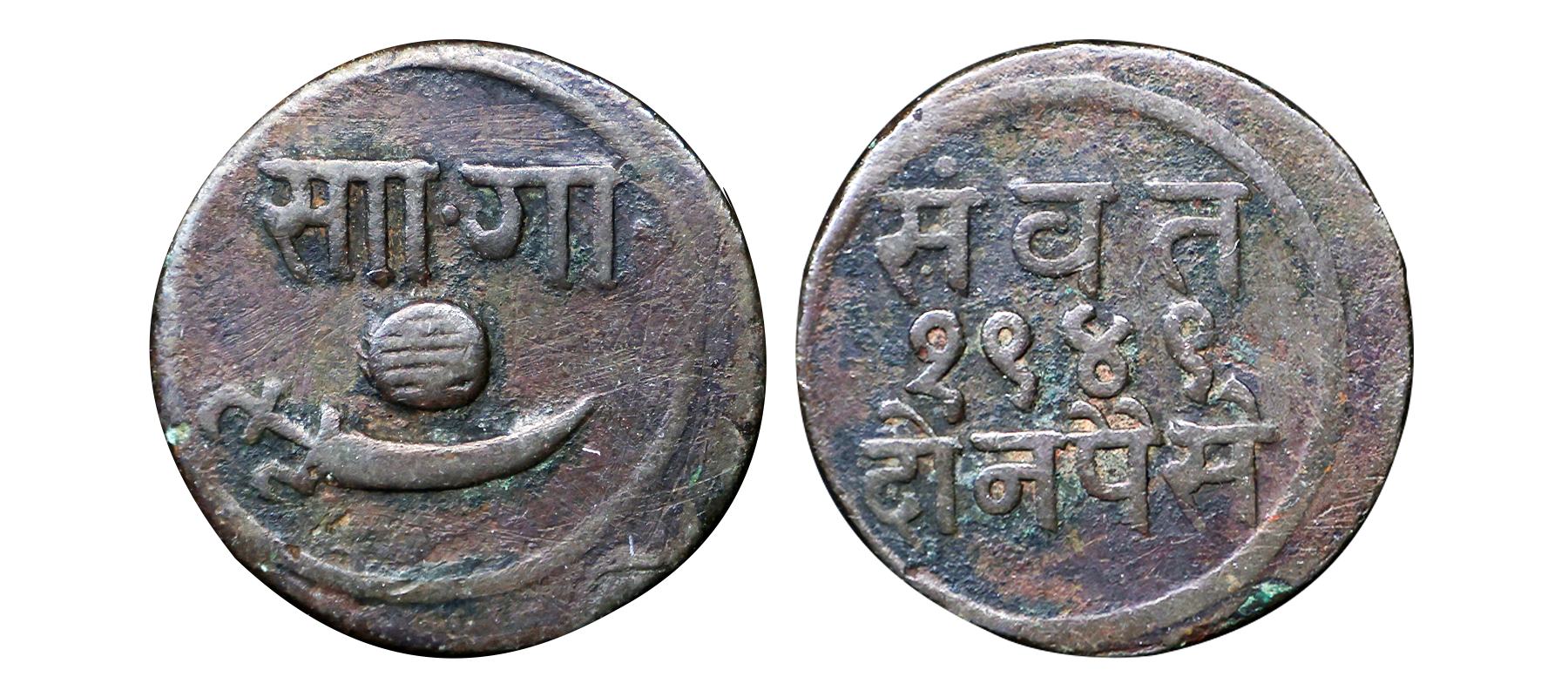 Baroda State, Sayaji Rao III (VS 1932-1995 / 1875-1938 AD), Copper 2 Paisa/Paisa, This is 2 paisa struck in the weight of 1 paisa, 7.77g, VS 1948, Obv: Nagari letter ‘Sa’ and ‘Ga’ with scimitar and shaded ball, Rev: Value and year. (KM # Y24).