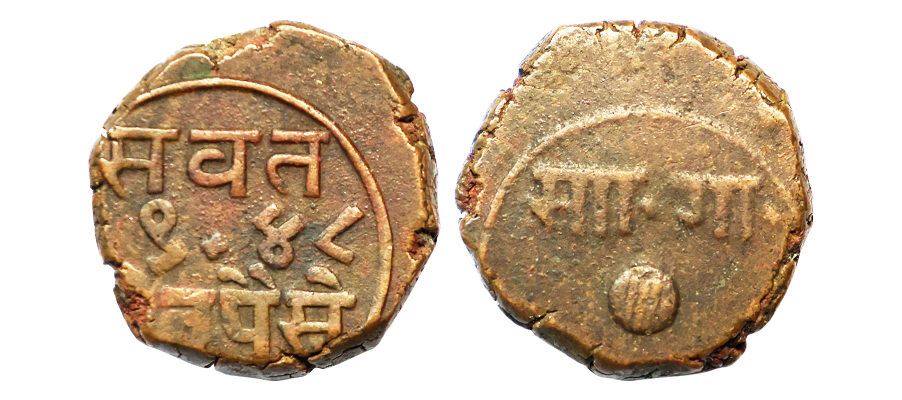 Baroda State, Sayaji Rao III (VS 1932-1995 / 1875-1938 AD), Copper 2 Paisa/Paisa, This is 2 paisa struck in the weight of 1 paisa, 7.77g, VS 1948, Obv: Nagari letter ‘Sa’ and ‘Ga’ with scimitar and shaded ball, Rev: Value and year. (KM # Y24).